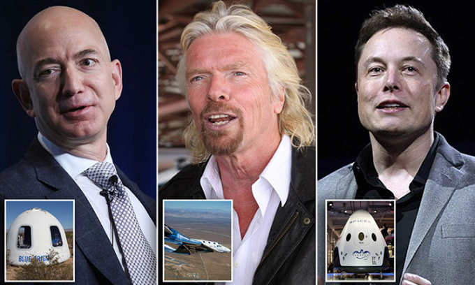 Từ trái qua phải: Nhà sáng lập Jeff Bezos (Blue Origin), Richard Branson (Virgin Galactic) và Elon Musk (SpaceX). Ảnh: Mail
