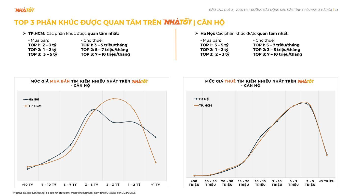 Trong khi thị trường đất nền có nhiều biến động, các phân khúc nhà ở lại cho thấy những diễn biến ổn định hơn. Phân khúc căn hộ ghi nhận sự tăng trưởng bền vững với lượng tin đăng bán tăng 23% và lượng tìm kiếm tăng 11% so với quý trước. Nhu cầu của người mua tại Hà Nội tập trung vào loại hình căn hộ 2 phòng ngủ với tầm giá 3-5 tỷ VNĐ.