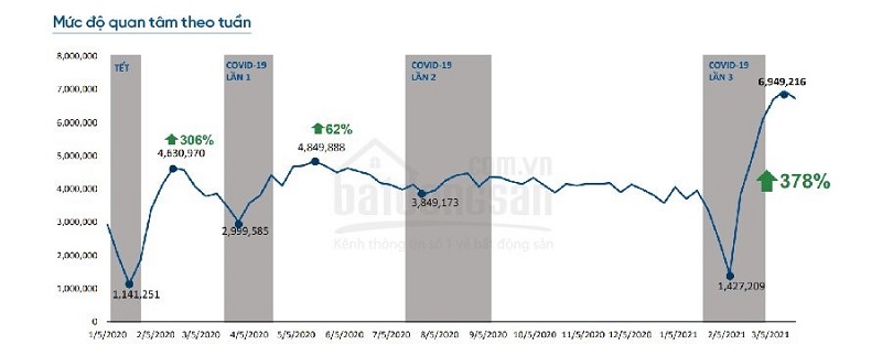 Trước đó, trong Báo cáo quý 1/2021, Batdongsan.com.vn cho biết khi dịch bùng phát, nhu cầu tìm kiếm nhà đất thường có xu hướng giảm mạnh, thậm chí chạm đáy nhưng ngay khi tình hình được kiểm soát, thị trường như một chiếc lò xo bị nén chặt, sẽ bật tăng mạnh mẽ. Đơn cử, trong đợt bùng phát Covid-19 vào tháng 2 năm nay, nhu cầu tìm kiếm BĐS đã giảm 50-100% so với cuối năm 2020. Tuy nhiên đến đầu tháng 3, chính phủ kiểm soát thành công dịch bệnh, mức độ quan tâm BĐS tăng vọt lên đến 378%.