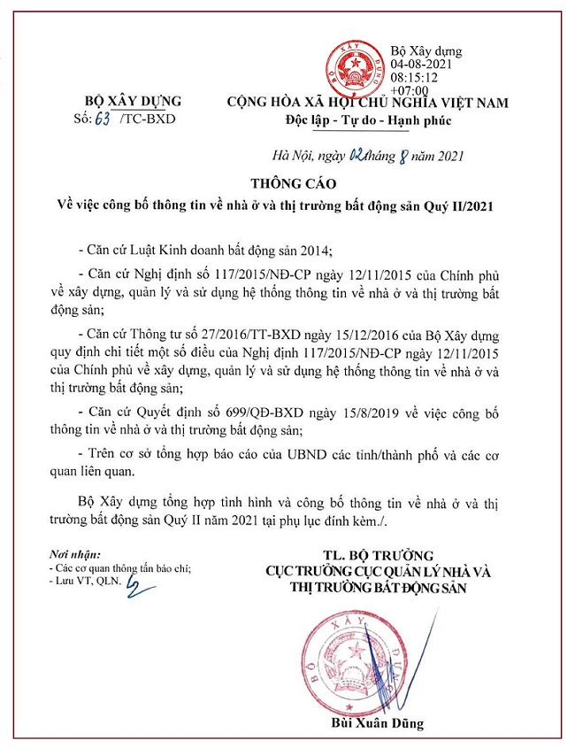 Thông cáo về nhà ở và thị trường bất động sản quý 2/2021 của Bộ Xây dựng.