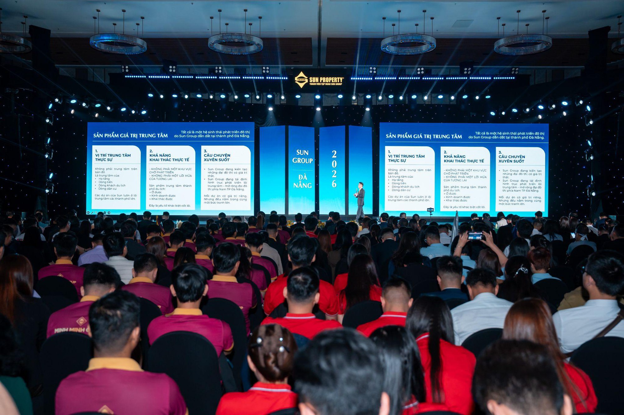 Từ sáng sớm, không gian sự kiện đã được hâm nóng bởi tinh thần nhiệt huyết của hơn 1.800 chuyên viên kinh doanh. Lấy chủ đề "Dòng chảy thời đại", Sun Property mang đến câu chuyện đầy cảm hứng về sự vươn mình của Đà Nẵng – từ một đô thị trẻ bên bờ biển miền Trung trở thành một trong những điểm đến năng động và đáng sống nhất Việt Nam. Trong dòng chảy hội tụ của du lịch, thương mại và những cơ hội đắt giá đó, Sun Group và Sun Property nói riêng tiếp tục khẳng định vị thế người tiên phong khi không ngừng kiến tạo những công trình biểu tượng, làm nên sức sống mới cho thành phố.