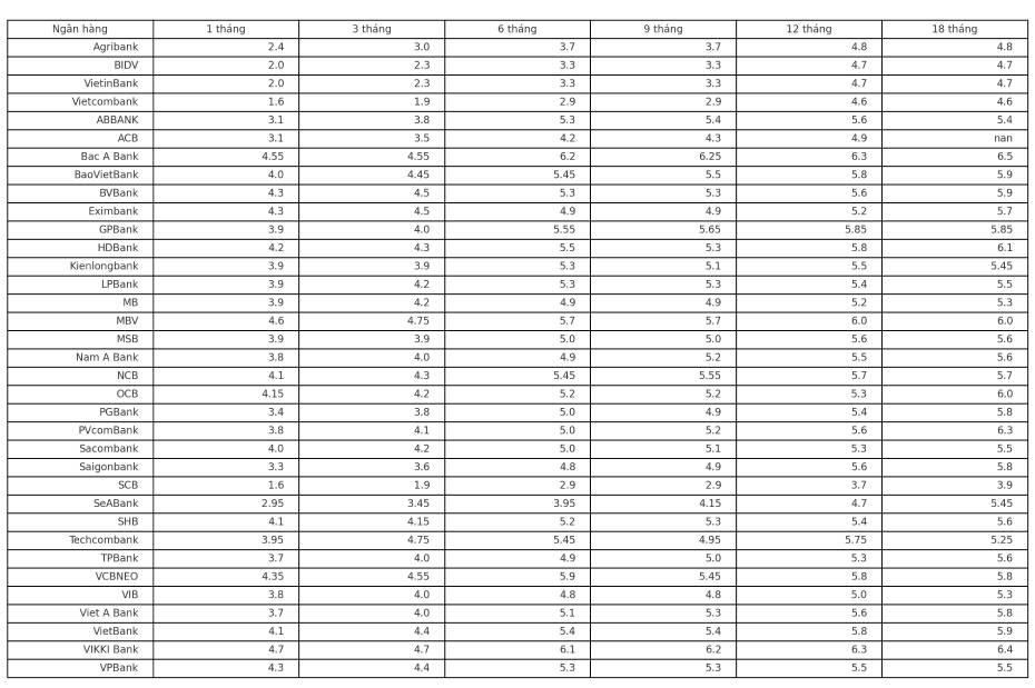 Tương tự, Ngân hàng số Vikki (Vikki Bank) cũng tăng lãi suất huy động trực tuyến: Kỳ hạn 1-5 tháng lên 4,7%, kỳ hạn 6 tháng 6,1%, kỳ hạn 12-13 tháng 6,3-6,4%, kỳ hạn 18 tháng 6,2%. Các hình thức huy động tại quầy cũng được nâng lên mức tương tự.
