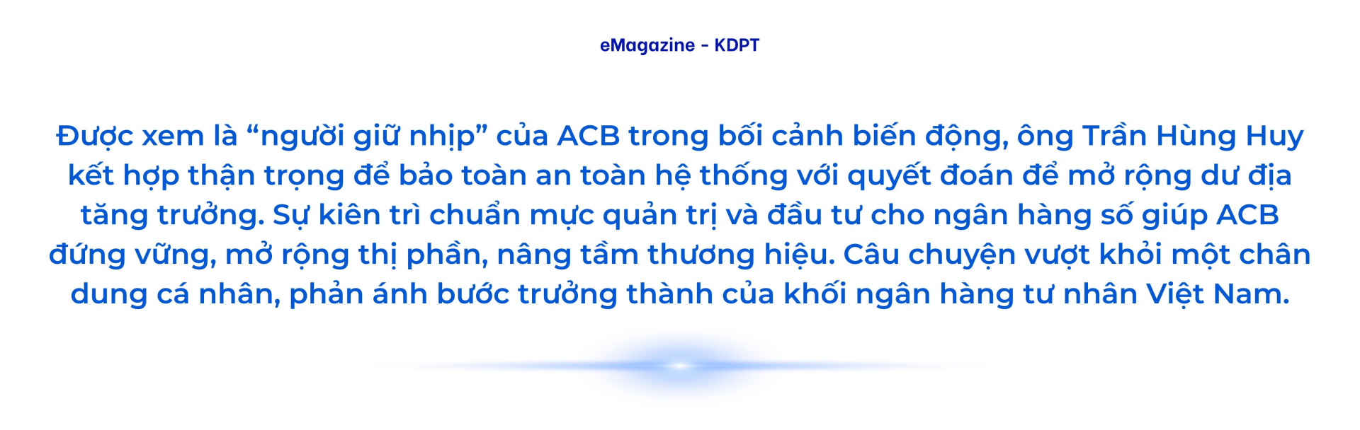 Có thể nói, “giữ nhịp” chính là phương pháp mà Trần Hùng Huy lựa chọn để đưa ACB vượt bão. Trong khi nhiều ngân hàng tìm kiếm sự bứt phá ngắn hạn, ông chọn con đường dài hơi, ổn định niềm tin, tái cấu trúc chiến lược, xây dựng văn hóa kỷ luật. Chính sự kiên định ấy đã giúp ACB không chỉ hồi phục sau khủng hoảng, mà còn định vị vững chắc trong nhóm ngân hàng tư nhân hàng đầu Việt Nam.
