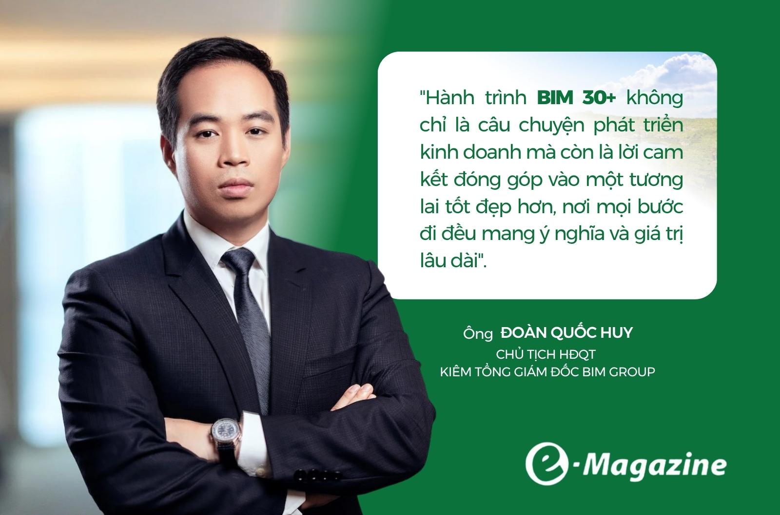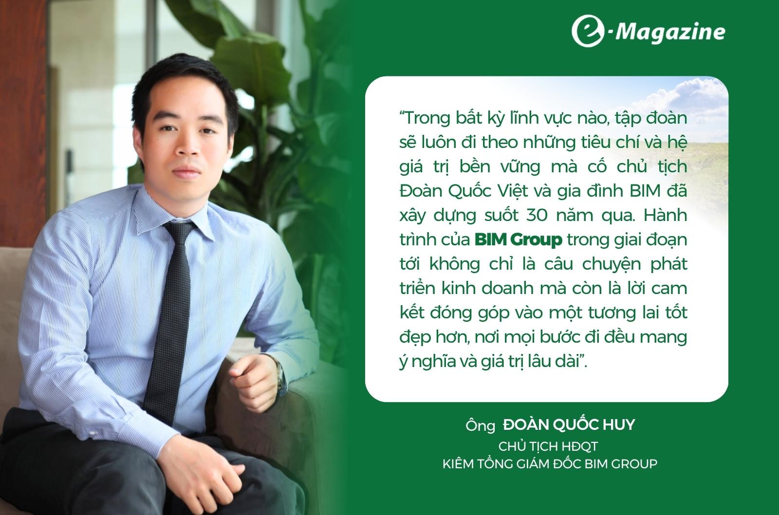 “Trong bất kỳ lĩnh vực nào, tập đoàn sẽ luôn đi theo những tiêu chí và hệ giá trị bền vững mà cố chủ tịch Đoàn Quốc Việt và gia đình BIM đã xây dựng suốt 30 năm qua. Hành trình của BIM Group trong giai đoạn tới không chỉ là câu chuyện phát triển kinh doanh mà còn là lời cam kết đóng góp vào một tương lai tốt đẹp hơn, nơi mọi bước đi đều mang ý nghĩa và giá trị lâu dài”, chủ tịch HĐQT Đoàn Quốc Huy chia sẻ về tầm nhìn của BIM Group trong dịp kỷ niệm 30 năm thành lập”.