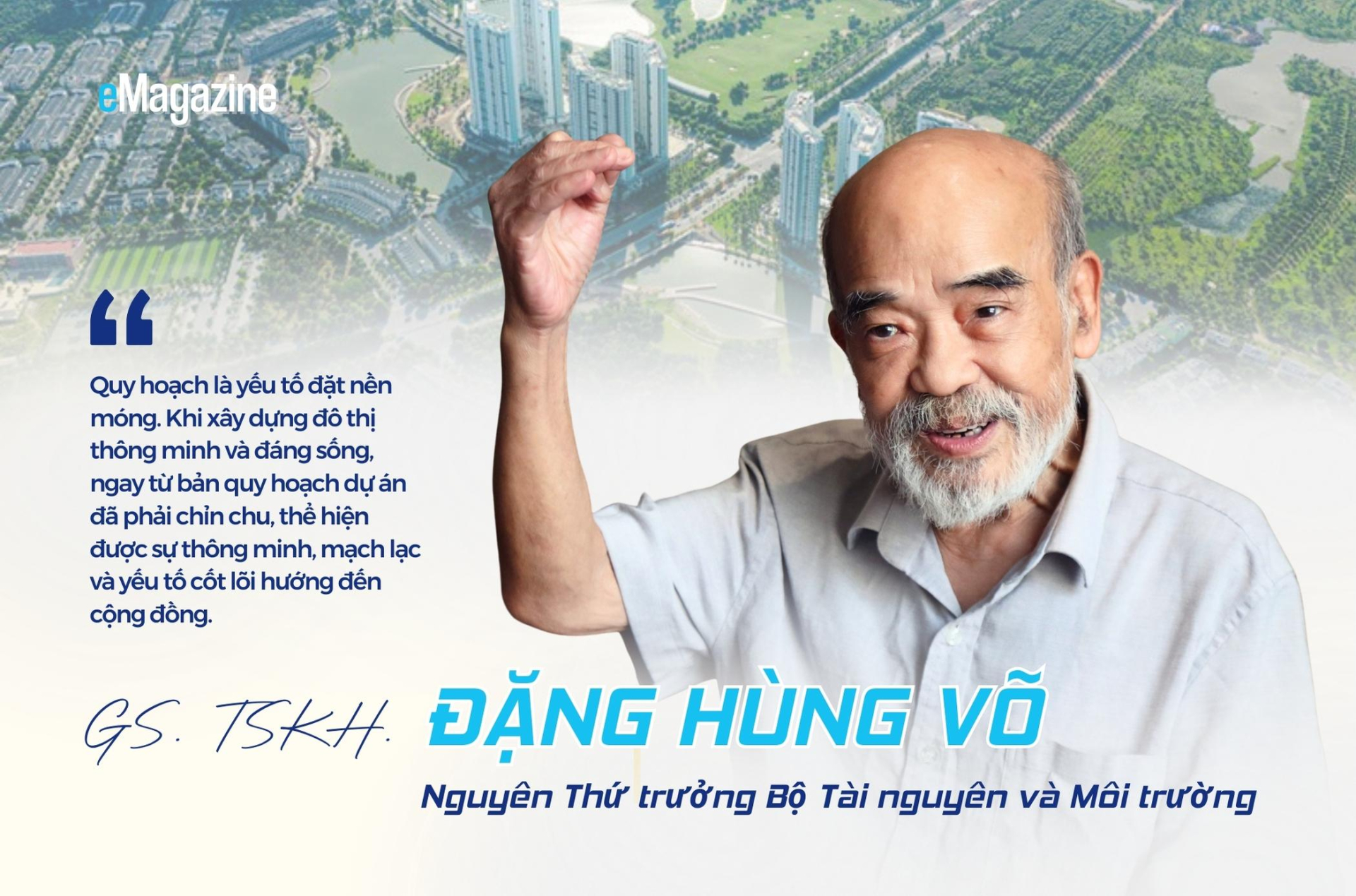 Từ góc nhìn quy hoạch, GS. TSKH. Đặng Hùng Võ, nguyên Thứ trưởng Bộ Tài nguyên và Môi trường nhấn mạnh: “Quy hoạch là yếu tố đặt nền móng. Khi xây dựng đô thị thông minh và đáng sống, ngay từ bản quy hoạch dự án đã phải chỉn chu, thể hiện được sự thông minh, mạch lạc và yếu tố cốt lõi hướng đến cộng đồng”.
