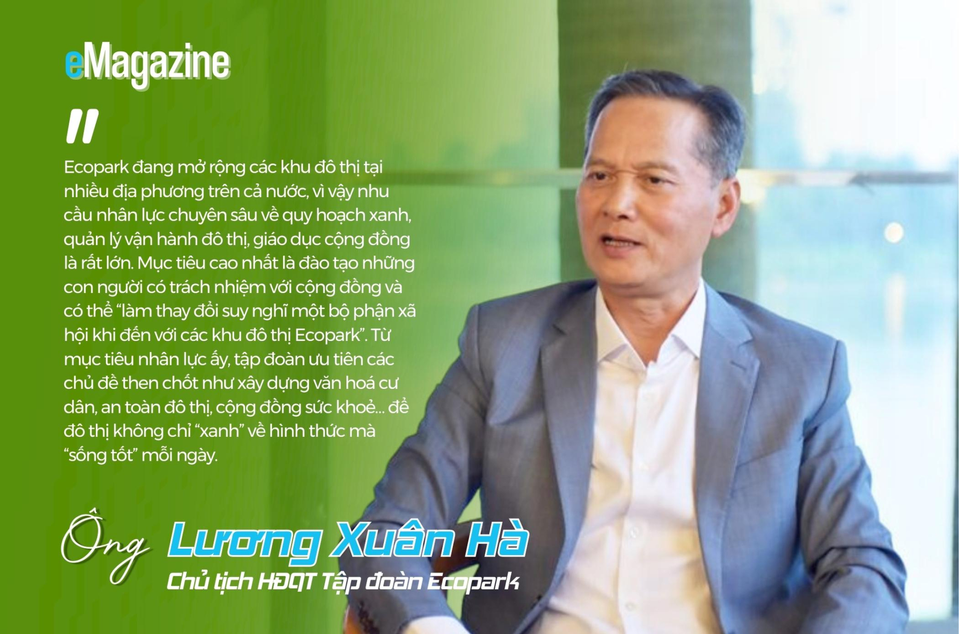 Chủ tịch Lương Xuân Hà cho biết, Ecopark đang mở rộng các khu đô thị tại nhiều địa phương trên cả nước, vì vậy nhu cầu nhân lực chuyên sâu về quy hoạch xanh, quản lý vận hành đô thị, giáo dục cộng đồng là rất lớn. Mục tiêu cao nhất, theo ông, là đào tạo những con người có trách nhiệm với cộng đồng và có thể “làm thay đổi suy nghĩ một bộ phận xã hội khi đến với các khu đô thị Ecopark. Từ mục tiêu nhân lực ấy, tập đoàn ưu tiên các chủ đề then chốt như xây dựng văn hoá cư dân, an toàn đô thị, cộng đồng sức khoẻ… để đô thị không chỉ “xanh” về hình thức mà “sống tốt” mỗi ngày.