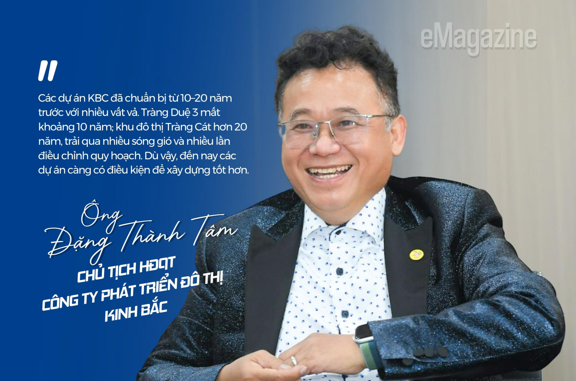 Nói về độ “dài hơi” của hồ sơ, ông Đặng Thành Tâm đúc kết: “Các dự án KBC đã chuẩn bị từ 10–20 năm trước với nhiều vất vả. Tràng Duệ 3 mất khoảng 10 năm; khu đô thị Tràng Cát hơn 20 năm, trải qua nhiều sóng gió và nhiều lần điều chỉnh quy hoạch. Dù vậy, đến nay các dự án càng có điều kiện để xây dựng tốt hơn”.
