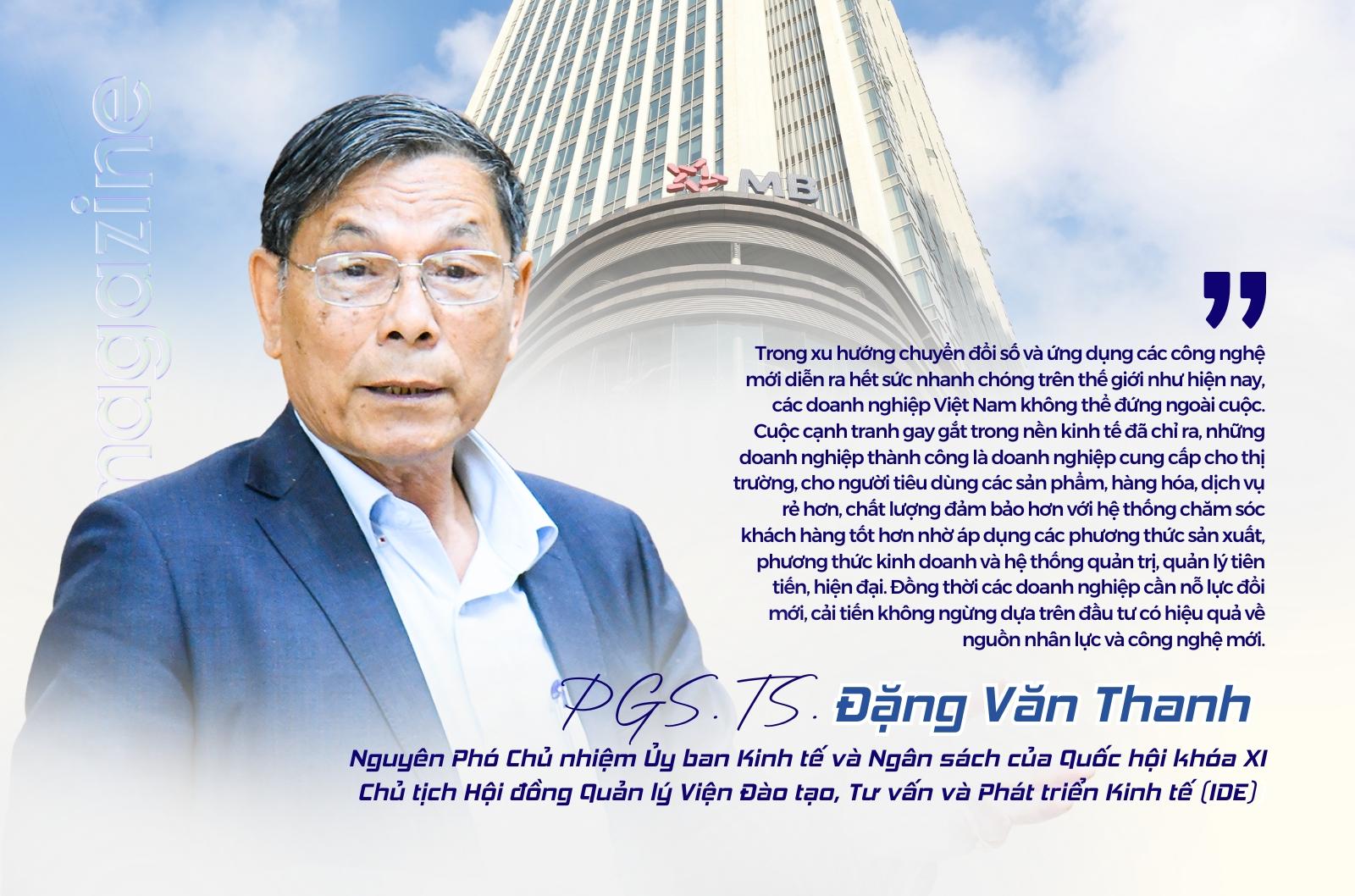 PGS.TS Đặng Văn Thanh – Nguyên Phó Chủ nhiệm Ủy ban Kinh tế và Ngân sách của Quốc hội khóa XI, Chủ tịch Hội đồng Quản lý Viện Đào tạo, Tư vấn và Phát triển Kinh tế (IDE) từng nhận định: "Trong xu hướng chuyển đổi số và ứng dụng các công nghệ mới diễn ra hết sức nhanh chóng trên thế giới như hiện nay, các doanh nghiệp Việt Nam không thể đứng ngoài cuộc. Cuộc cạnh tranh gay gắt trong nền kinh tế đã chỉ ra, những doanh nghiệp thành công là doanh nghiệp cung cấp cho thị trường, cho người tiêu dùng các sản phẩm, hàng hóa, dịch vụ rẻ hơn, chất lượng đảm bảo hơn với hệ thống chăm sóc khách hàng tốt hơn nhờ áp dụng các phương thức sản xuất, phương thức kinh doanh và hệ thống quản trị, quản lý tiên tiến, hiện đại. Đồng thời các doanh nghiệp cần nỗ lực đổi mới, cải tiến không ngừng dựa trên đầu tư có hiệu quả về nguồn nhân lực và công nghệ mới". Nhìn vào những bước đi bài bản và có chiều sâu của MB, có thể thấy tinh thần ấy đã được cụ thể hóa thành hành động thực tiễn, đặt nền móng vững chắc cho sự phát triển dài hạn.