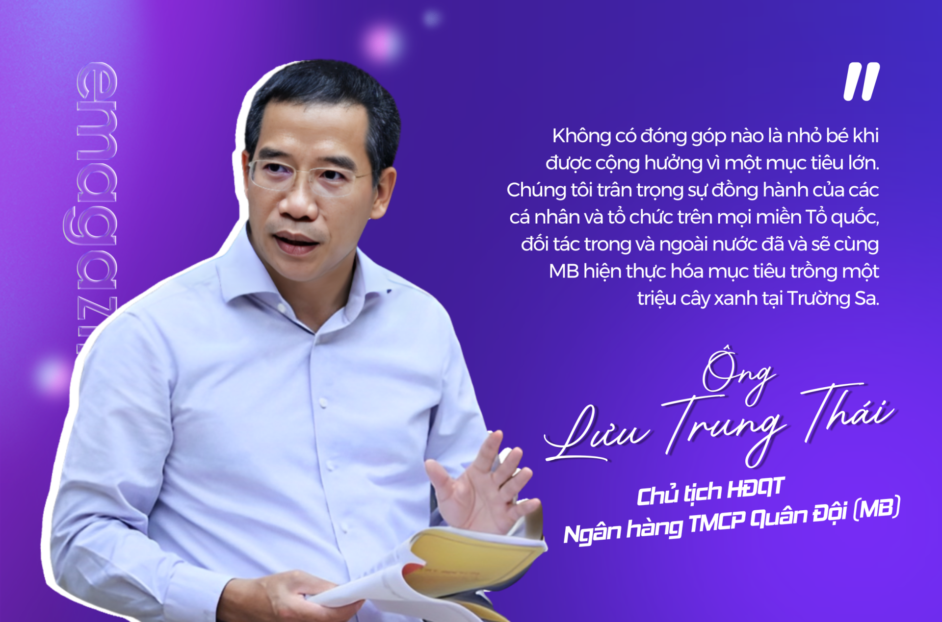 Không chỉ chú trọng đến sự phát triển kinh doanh, ông Thái còn khẳng định trách nhiệm xã hội sâu sắc của MB thông qua những sáng kiến ý nghĩa, trong đó nổi bật là chương trình trồng một triệu cây xanh tại Trường Sa. Chủ tịch MB chia sẻ: "Không có đóng góp nào là nhỏ bé khi được cộng hưởng vì một mục tiêu lớn. Chúng tôi trân trọng sự đồng hành của các cá nhân và tổ chức trên mọi miền Tổ quốc, đối tác trong và ngoài nước đã và sẽ cùng MB hiện thực hóa mục tiêu trồng một triệu cây xanh tại Trường Sa".