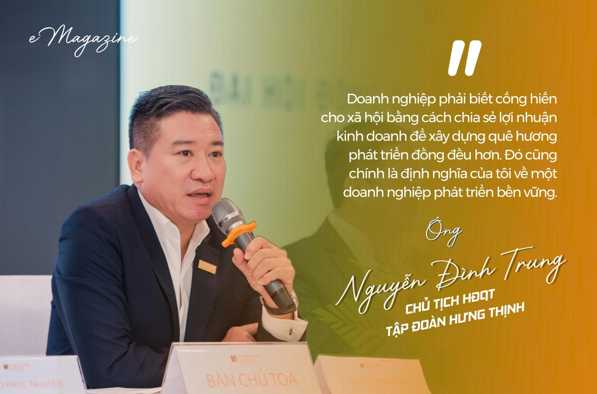 Bên cạnh hoạt động kinh doanh, Chủ tịch Nguyễn Đình Trung kiên trì theo đuổi tinh thần phụng sự cộng đồng. Ông nhiều lần nhấn mạnh quan điểm: “Doanh nghiệp phải biết cống hiến cho xã hội bằng cách chia sẻ lợi nhuận kinh doanh để xây dựng quê hương phát triển đồng đều hơn. Đó cũng chính là định nghĩa của tôi về một doanh nghiệp phát triển bền vững”.