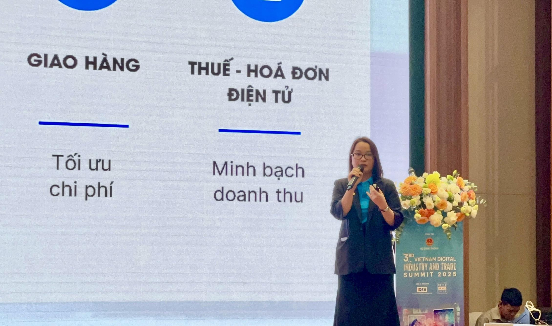 Trong nhóm giải pháp vận hành, bà Lê Thị Nga – Giám đốc Khối Social Commerce & Shipping, Công ty Cổ phần Công nghệ Sapo trình bày cách doanh nghiệp chuyển đổi số quy trình bán hàng thông qua bộ giải pháp OmniAI. Bà Nga cho biết Sapo đang hỗ trợ doanh nghiệp tối ưu quảng cáo bằng các công cụ như Conversion API và Value Optimization, đồng thời ứng dụng chatbot AI để tăng tỉ lệ chốt đơn. Bên cạnh đó, giải pháp FulfillMaster giúp tự động hóa xử lý đơn hàng, giảm sai sót và tăng tốc vận hành – yếu tố quan trọng trong môi trường TMĐT tăng trưởng nhanh.
