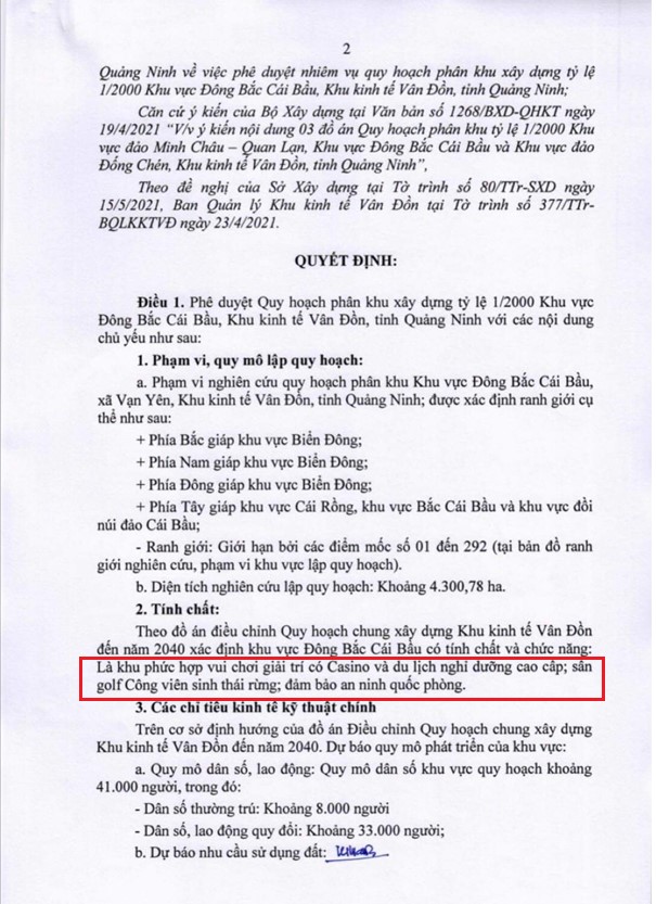 Văn bản có nêu rõ theo đồ án điều chỉnh Quy hoạch chung xây dựng Khu kinh tế Vân Đồn đến năm 2040 xác định khu vực Đông Bắc Cái Bầu có tỉnh chất và chức năng là Khu phức hợp vui chơi giải trí có Casino và du lịch nghỉ dưỡng cao cấp, sân golf Công viên sinh thái rừng, đảm bảo an ninh quốc phòng.