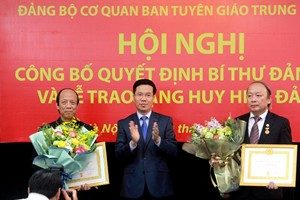 Nhân dịp này, Đảng bộ Cơ quan Ban Tuyên giáo Trung ương đã long trọng tổ chức Lễ trao Huy hiệu 40 năm tuổi Đảng cho đồng chí Võ Văn Phuông và đồng chí Vũ Việt Hùng; trao huy hiệu 30 năm tuổi Đảng cho đồng chí Đỗ Đình Hoằng.