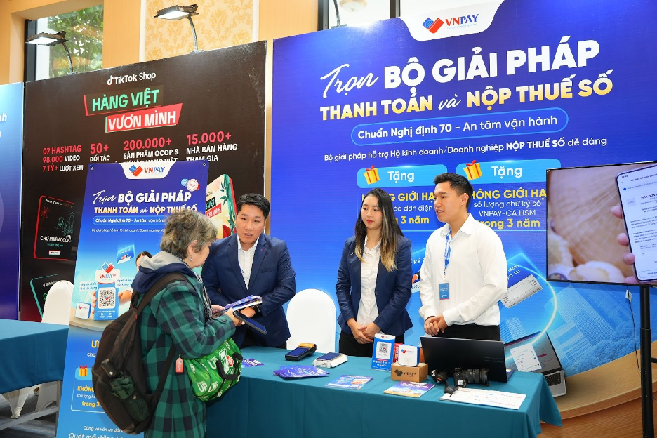 Góp phần hoàn thiện hạ tầng giao dịch số, VNPAY mang đến giải pháp hỗ trợ doanh nghiệp thanh toán và nộp thuế số với khả năng tích hợp đa nền tảng, xử lý giao dịch nhanh, đối soát tự động và bảo mật nâng cao. Các giải pháp giúp doanh nghiệp an tâm vận hành, tối ưu quản lý dòng tiền và đáp ứng nhu cầu giao dịch số ngày càng tăng trong thương mại điện tử và dịch vụ trực tuyến. Sự hiện diện của VNPAY tại triển lãm khẳng định vai trò thiết yếu của các giải pháp thanh toán hiện đại trong thúc đẩy hoạt động kinh doanh và chuyển đổi số doanh nghiệp.