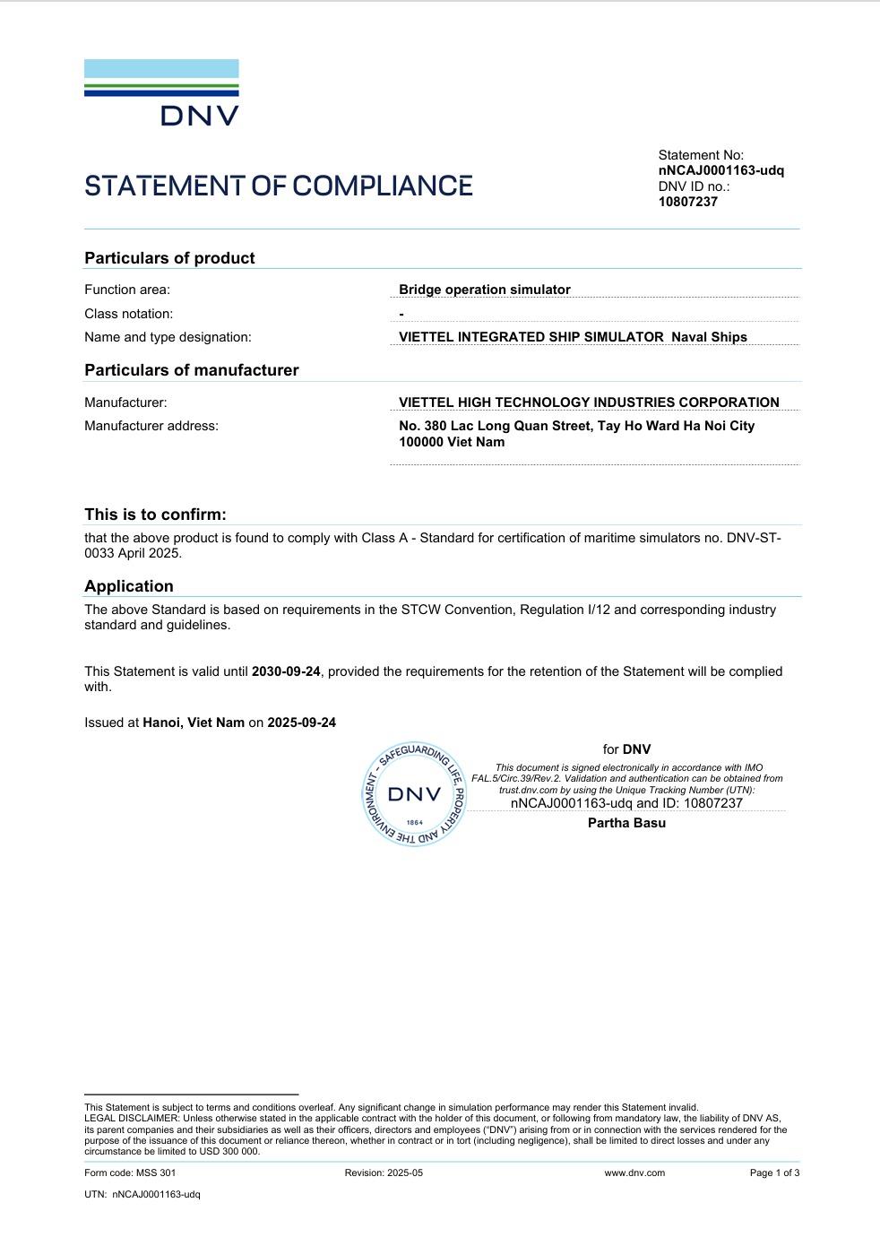 | DNV chia hệ thống mô phỏng huấn luyện hàng hải thành năm cấp độ và Class A là cấp cao nhất, cho phép huấn luyện đầy đủ và sát thực tế toàn bộ các nhiệm vụ hàng hải có thể thực hiện trên tàu thật. Hệ thống của Viettel đã đáp ứng toàn bộ các yêu cầu kỹ thuật, được đánh giá trực tiếp bởi chuyên gia DNV thông qua hơn 120 bài đo và 56 chỉ tiêu kỹ thuật thuộc ba nhóm yêu cầu chính: Physical Realism (mức độ mô phỏng chính xác các đặc tính vật lý của tàu và môi trường), Behavioural Realism (mức độ tái hiện đúng hành vi của con người, hệ thống và các đối tượng liên quan) và Operating Environment (mức độ mô phỏng chân thực điều kiện địa lý, thời tiết và môi trường hoạt động). Tất cả các hạng mục đều được đánh giá đạt yêu cầu, trong đó nhiều nội dung còn vượt mức tiêu chuẩn. |