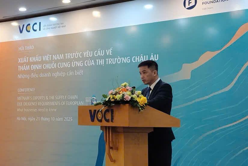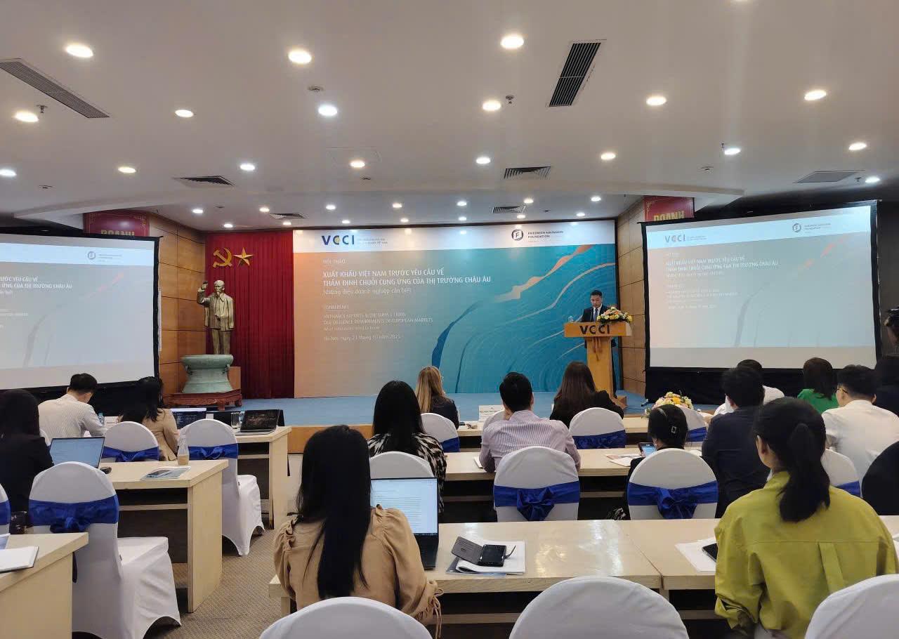 Hội thảo được VCCI phối hợp Viện Friedrich Naumann Foundation (CHLB Đức) tổ chức vào sáng ngày 21/10, nhằm cung cấp cho các doanh nghiệp, hiệp hội, các cơ quan tổ chức liên quan thông tin cơ bản, chính xác về các quy định thẩm định chuỗi cung ứng của thị trường châu Âu, qua đó có sự chuẩn bị và hành động phù hợp để Việt Nam tiếp tục xuất khẩu bền vững sang thị trường quan trọng này.