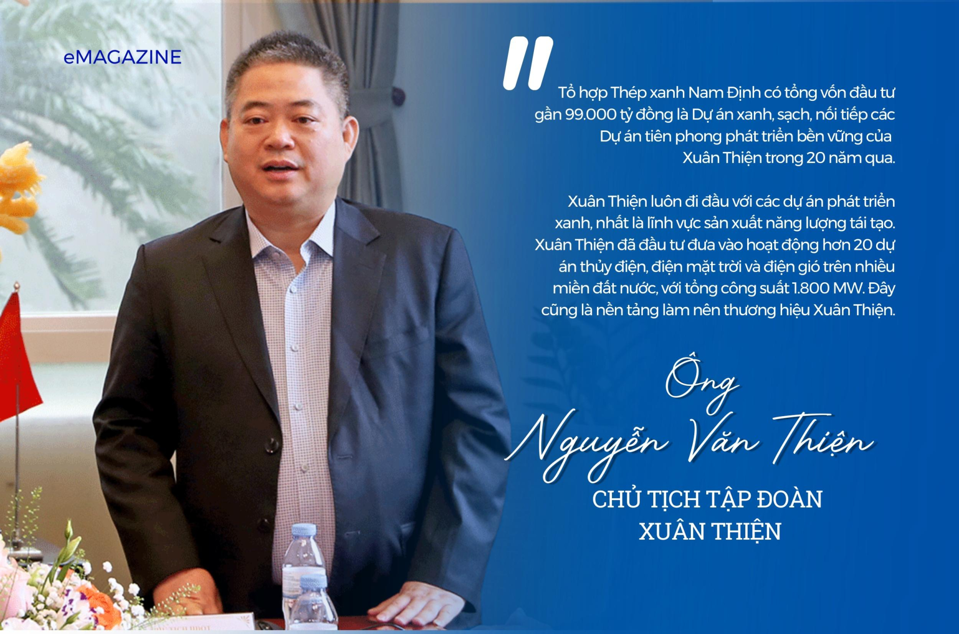 Đây là một bước đi lớn chưa từng có trong ngành luyện kim của Việt Nam, thể hiện rõ tầm nhìn và cam kết phát triển xanh của Tập đoàn Xuân Thiện. Ông Nguyễn Văn Thiện chia sẻ: “Tổ hợp Thép xanh Nam Định có tổng vốn đầu tư gần 99.000 tỷ đồng là Dự án xanh, sạch, nối tiếp các Dự án tiên phong phát triển bền vững của Xuân Thiện trong 20 năm qua.