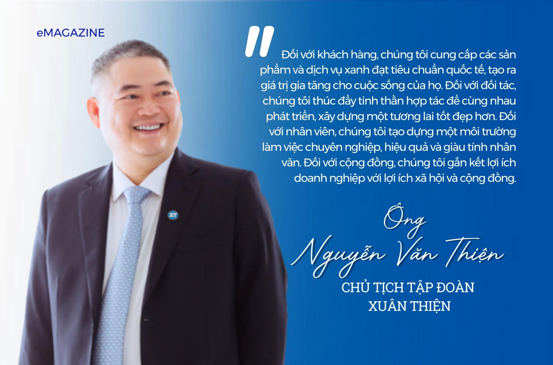 Chủ tịch Tập đoàn Xuân Thiện chia sẻ: “Đối với khách hàng, chúng tôi cung cấp các sản phẩm và dịch vụ xanh đạt tiêu chuẩn quốc tế, tạo ra giá trị gia tăng cho cuộc sống của họ. Đối với đối tác, chúng tôi thúc đẩy tinh thần hợp tác để cùng nhau phát triển, xây dựng một tương lai tốt đẹp hơn. Đối với nhân viên, chúng tôi tạo dựng một môi trường làm việc chuyên nghiệp, hiệu quả và giàu tính nhân văn. Đối với cộng đồng, chúng tôi gắn kết lợi ích doanh nghiệp với lợi ích xã hội và cộng đồng”.