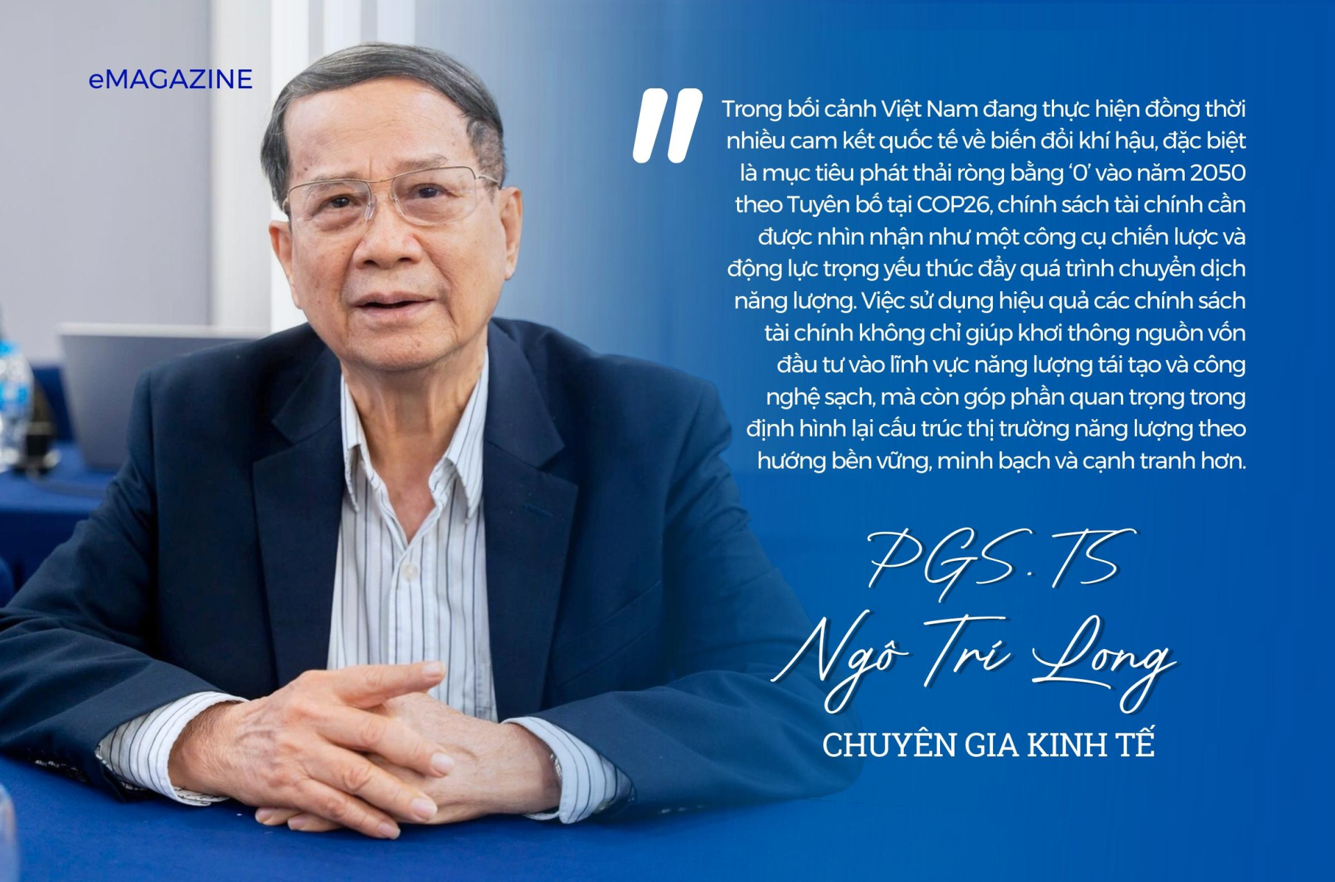 PGS.TS. Ngô Trí Long, chuyên gia kinh tế phân tích: “Trong bối cảnh Việt Nam đang thực hiện đồng thời nhiều cam kết quốc tế về biến đổi khí hậu, đặc biệt là mục tiêu phát thải ròng bằng “0” vào năm 2050 theo Tuyên bố tại COP26, chính sách tài chính cần được nhìn nhận như một công cụ chiến lược và động lực trọng yếu thúc đẩy quá trình chuyển dịch năng lượng. Việc sử dụng hiệu quả các chính sách tài chính không chỉ giúp khơi thông nguồn vốn đầu tư vào lĩnh vực năng lượng tái tạo và công nghệ sạch, mà còn góp phần quan trọng trong định hình lại cấu trúc thị trường năng lượng theo hướng bền vững, minh bạch và cạnh tranh hơn”.