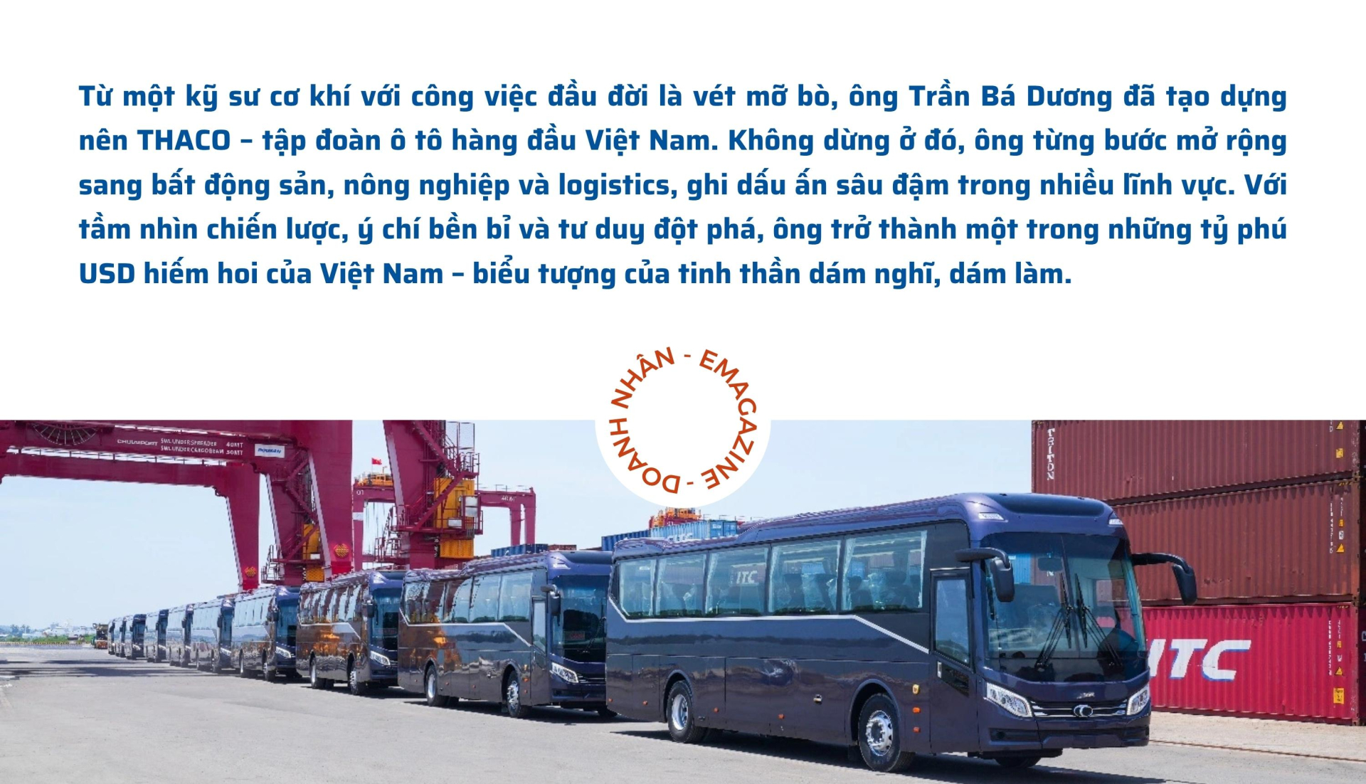 Ông Trần Bá Dương là hình mẫu tiêu biểu của một doanh nhân ít xuất hiện, ít nói, nhưng mỗi bước đi đều mang sức nặng của chiều sâu và thực lực. Ông không điều hành doanh nghiệp từ bàn họp, mà từ chính sự trải nghiệm, từng là kỹ sư, từng lăn lộn dưới gầm xe, từng trực tiếp chỉ đạo vận hành dây chuyền. Sự thấu hiểu cốt lõi ấy giúp ông nhìn ra những mắt xích quan trọng nhất trong hệ thống sản xuất, từ đó thiết kế nên chuỗi giá trị khép kín mang đậm dấu ấn công nghiệp hiện đại.