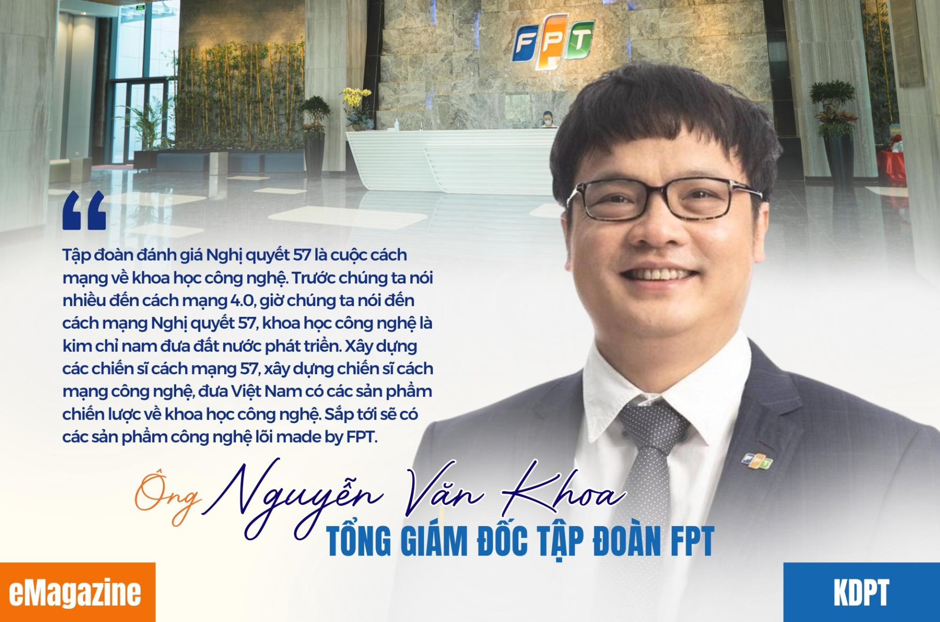 Ông Nguyễn Văn Khoa, Tổng Giám đốc Tập đoàn FPT nhấn mạnh: “Tập đoàn đánh giá Nghị quyết 57 là cuộc cách mạng về khoa học công nghệ. Trước chúng ta nói nhiều đến cách mạng 4.0, giờ chúng ta nói đến cách mạng Nghị quyết 57, khoa học công nghệ là kim chỉ nam đưa đất nước phát triển. Xây dựng các chiến sĩ cách mạng 57, xây dựng chiến sĩ cách mạng công nghệ, đưa Việt Nam có các sản phẩm chiến lược về khoa học công nghệ. Sắp tới sẽ có các sản phẩm công nghệ lõi made by FPT”.