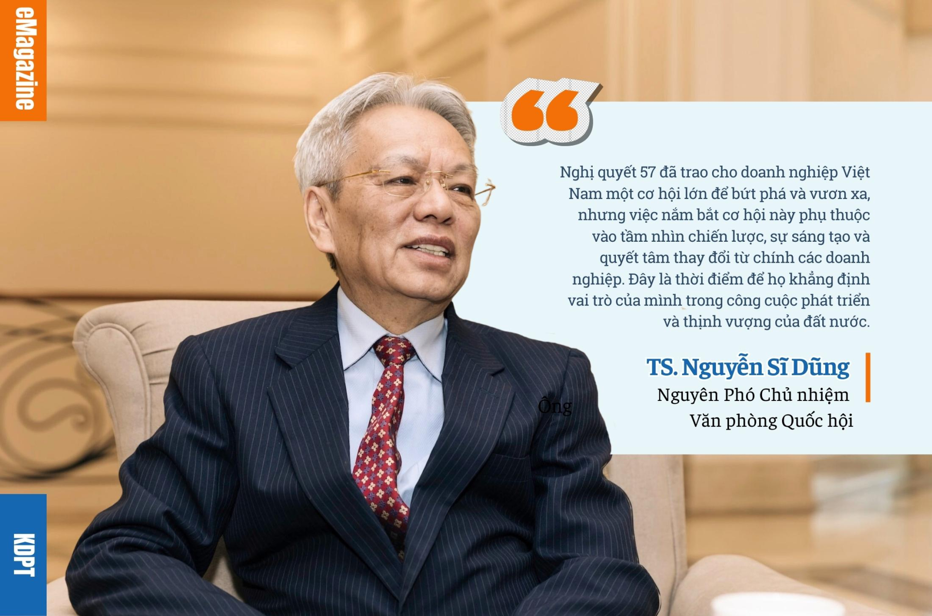 TS. Nguyễn Sĩ Dũng cũng từng khẳng định rằng: “Nghị quyết 57 đã trao cho doanh nghiệp Việt Nam một cơ hội lớn để bứt phá và vươn xa, nhưng việc nắm bắt cơ hội này phụ thuộc vào tầm nhìn chiến lược, sự sáng tạo và quyết tâm thay đổi từ chính các doanh nghiệp. Đây là thời điểm để họ khẳng định vai trò của mình trong công cuộc phát triển và thịnh vượng của đất nước”.