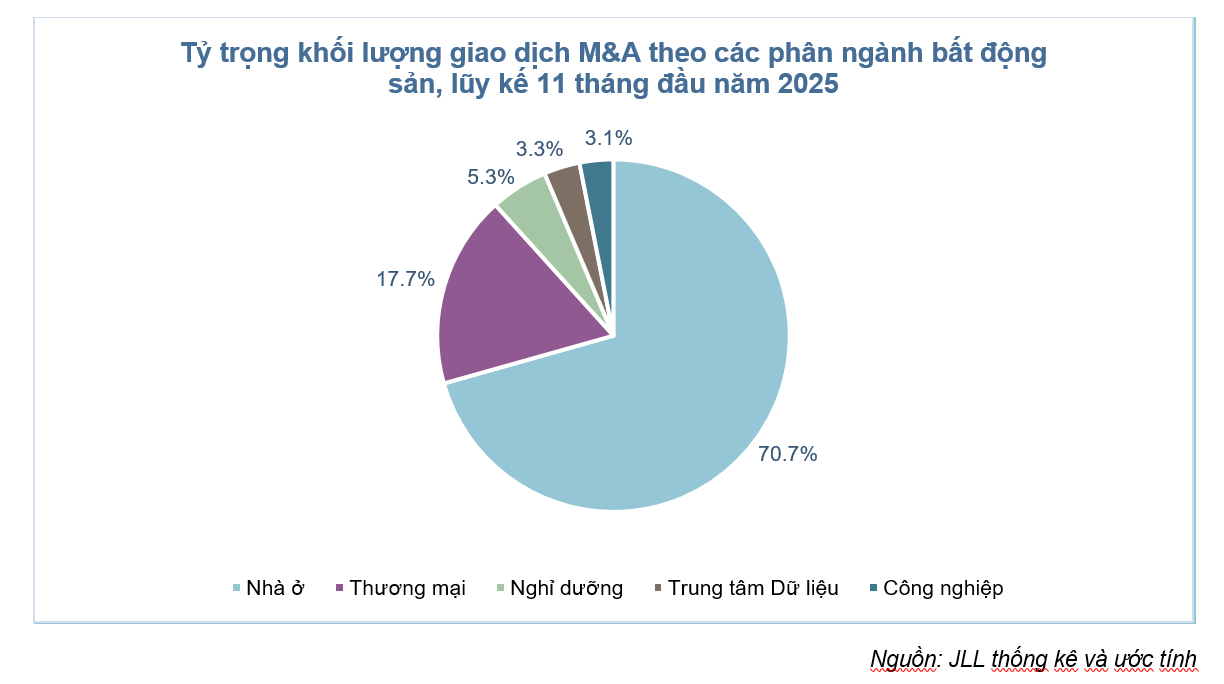 Đáng chú ý, lĩnh vực bất động sản nhà ở dẫn đầu khi chiếm tỷ trọng hơn 70% tổng khối lượng giao dịch M&A, tương đương 1,68 tỷ USD.