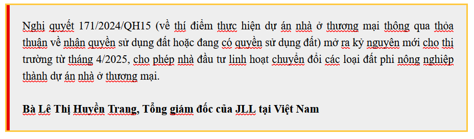 "Điều này sẽ thúc đẩy mạnh các thương vụ M&A trong phân khúc nhà ở, nơi đang có tình trạng thiếu hụt nguồn cung kéo dài và tỷ lệ hấp thụ cao", theo JLL.