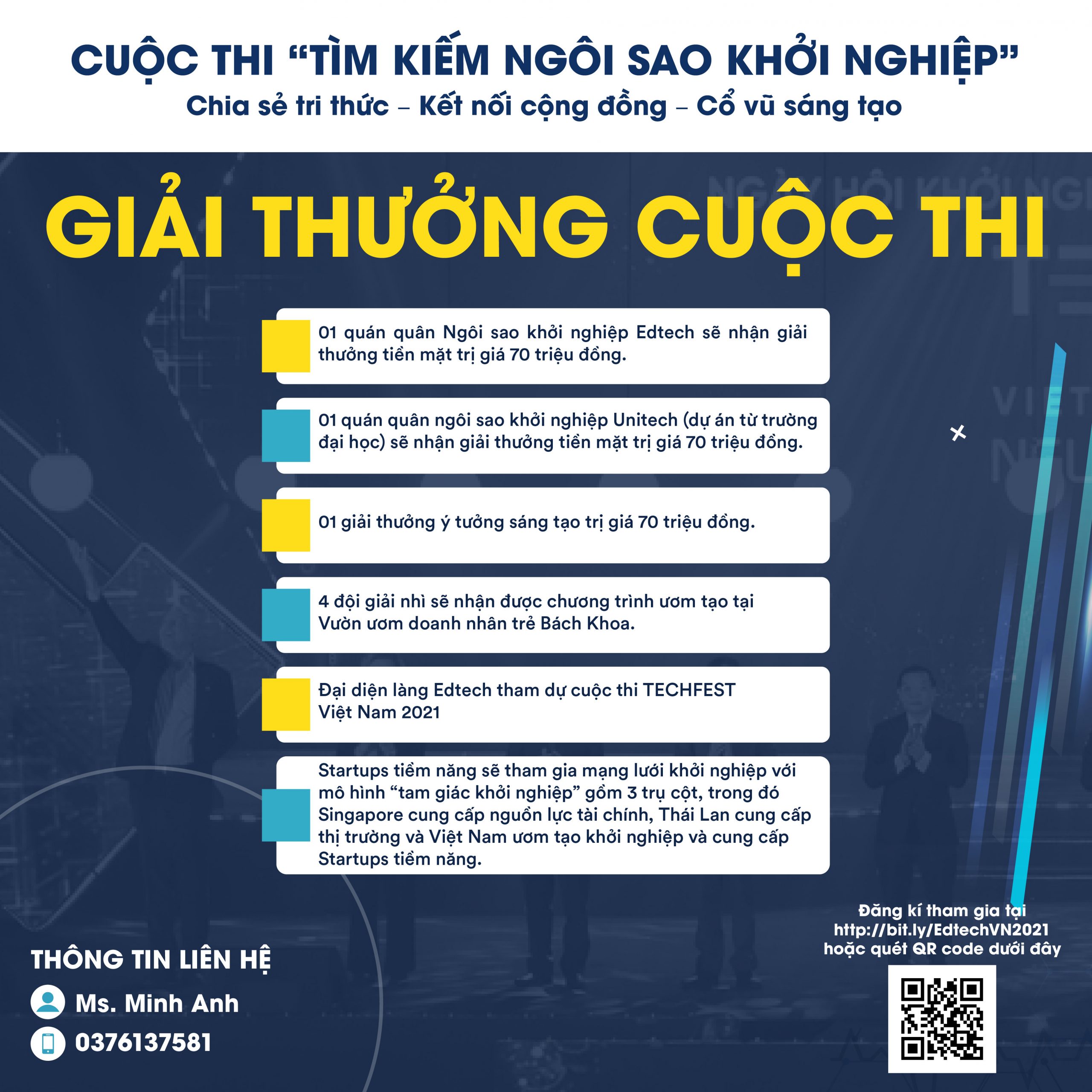 Cuộc thi nhằm tìm ra 01 quán quân ngôi sao khởi nghiệp Edtech, 01 quán quân ngôi sao khởi nghiệp Unitech (dự án từ trường đại học), 01 giải thưởng ý tưởng sáng tạo với giải thưởng tiền mặt là 210 triệu VNĐ cho 3 đội và 4 đội giải nhì sẽ nhận được chương trình ươm tạo tại Vườn ươm doanh nhân trẻ Bách Khoa. Các đơn vị có cơ hội trở thành đại diện làng Edtech tham dự cuộc thi TECHFEST Việt Nam 2021. Sự khác biệt lớn nhất ở cuộc thi nhằm tìm kiếm đầu vào cho mạng lưới khởi nghiệp với mô hình “tam giác khởi nghiệp” gồm 3 trụ cột, trong đó Singapore cung cấp nguồn lực tài chính, Thái Lan cung cấp thị trường và Việt Nam ươm tạo khởi nghiệp và cung cấp Startups tiềm năng.
