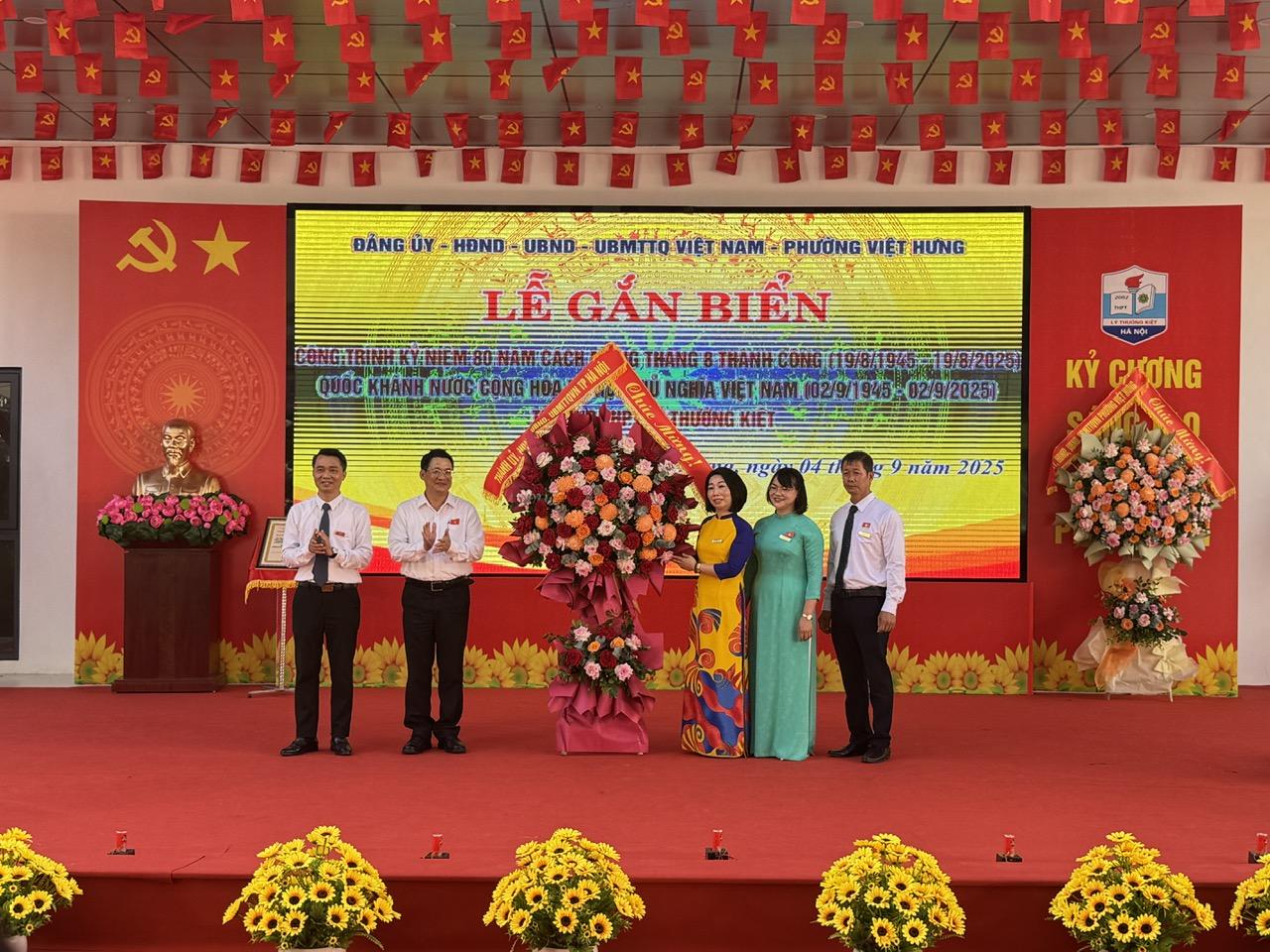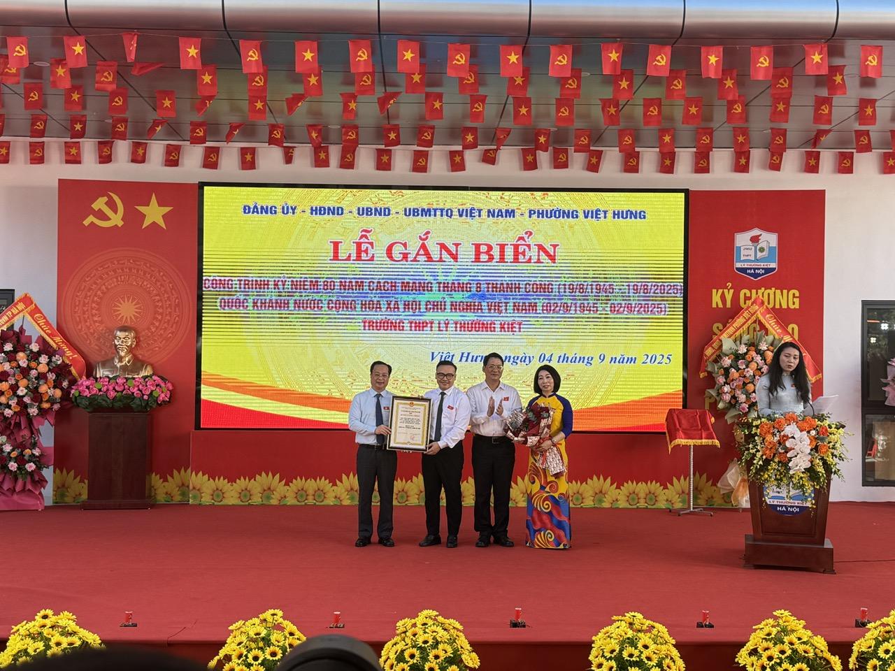 Nhân dịp này, thay mặt lãnh đạo TP Hà Nội, Phó trưởng Ban Tuyên giáo và Dân vận Thành ủy Hà Nội Vũ Hà, Giám đốc Sở Giáo dục và Đào tạo Trần Thế Cương đã trao Quyết định công nhận công trình kỷ niệm 80 năm Cách mạng tháng Tám và Quốc khánh 2/9 trường THPT Lý Thường Kiệt, cùng lãnh đạo phường Việt Hưng công bố, trao khen thưởng của UBND Thành phố, UBND phường Việt Hưng cho các tập thể, cá nhân có thành tích xuất sắc, tặng hoa, chúc mừng thầy và trò nhà trường nhân dịp chuẩn bị đón chào năm học mới 2025 - 2026./.