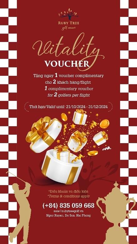 Chương trình Vitality Voucher là một chương trình đặc biệt nhằm gửi lời cám ơn tới các hội viên và khách hàng của sân Ruby Tree Golf Resort. Từ ngày 21/10/2024 đến 31/12/2024, mỗi 2 gôn thủ đăng ký chơi cùng 1 flight trên sân sẽ được tặng 01 voucher complimentary tại sân Ruby Tree Golf Resort. Gôn thủ chơi ngày thường sẽ nhận được voucher ngày thường, gôn thủ chơi cuối tuần nhận được voucher cuối tuần. Tất cả voucher sẽ có thời hạn sử dụng đến hết ngày 30/6/2025.