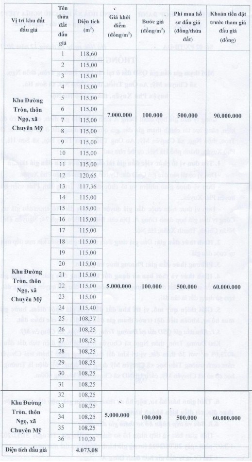 Danh sách các lô đất đấu giá tại xã Chuyên Mỹ.