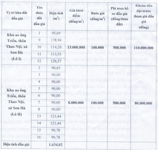 16 thửa đất còn lại thuộc Khu Ao Ông Triều, thôn Thao Nội, xã Sơn Hà với tổng diện tích là 1.634,02 m2, vị trí khu đất thuộc làng nghề túi xách thôn Thao Nội, xã Sơn Hà, cách trục đường liên xã đi vào làng nghề mộc truyền thống Tân Dân, làng nghề khảm trai Chuyên Mỹ khoảng 150 m, cách trung tâm hành chính huyện Phú Xuyên và Quốc lộ 1A khoảng 1 km, có mặt tiếp giáp với đường bê tông rộng 6 m. Mỗi thửa đất này có diện tích từ 90 m2 đến 128,94 m2 với mức giá khởi điểm từ 8 triệu đồng đến 13 triệu đồng/m2.