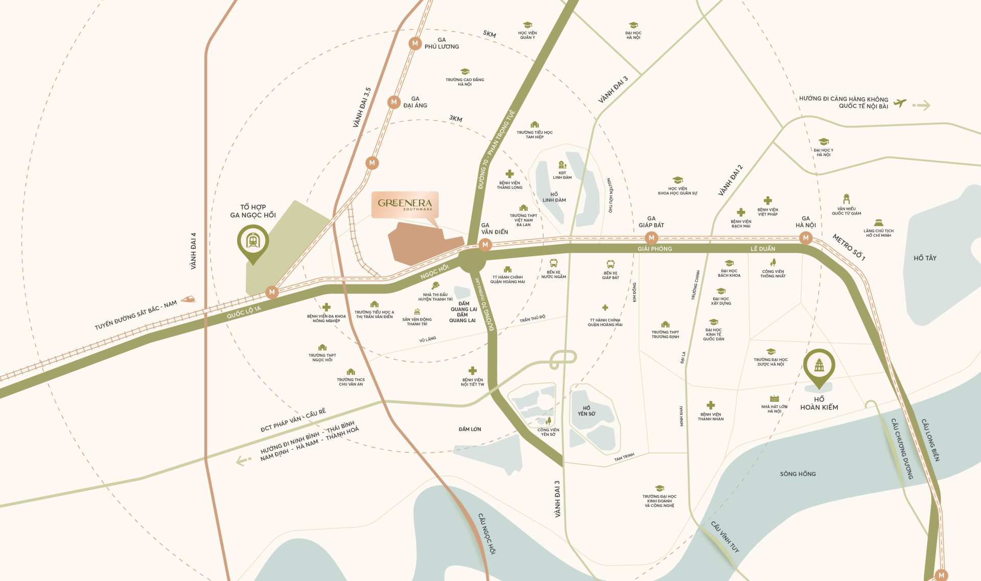 Chỉ cách Cầu Ngọc Hồi khoảng 10 phút di chuyển, Greenera Southmark được hưởng lợi trực tiếp khi công trình đi vào vận hành. Cây cầu không chỉ kết nối hai bờ sông Hồng mà còn đóng vai trò “kích hoạt” hàng loạt hạ tầng liên kết trong khu vực, gia tăng năng lực giao thương và thúc đẩy giá trị phát triển cho toàn bộ phía Nam Hà Nội, trong đó có Ngọc Hồi.