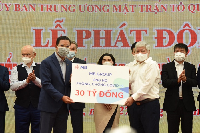 Với trách nhiệm của mình, Tập đoàn Tài chính MB đã ủng hộ 30 tỷ đồng ủng hộ cho MTTQ để mua vaccine và 30 tỷ đồng đóng góp vào Quỹ vaccine phòng COVID-19, nâng tổng số tiền mà Tập đoàn MB trao tặng, ủng hộ phòng, chống COVID-19 đến thời điểm này lên tới khoảng 100 tỷ đồng.