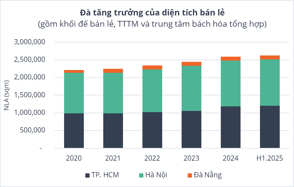Số liệu bất động sản càng củng cố xu hướng này. Từ năm 2020 đến nửa đầu năm 2025, tổng diện tích cho thuê thực (NLA) của khối đế bán lẻ, TTTM và trung tâm bách hóa tổng hợp tại Hà Nội, Đà Nẵng và TP.HCM đã ghi nhận tốc độ tăng trưởng kép hàng năm (CAGR) đạt 3,13%, tương đương 2,6 triệu m² tính đến hết quý 2/2025. Trong các mô hình MT, cửa hàng tiện lợi là loại hình tăng trưởng nhanh nhất nhờ nhu cầu về tính thuận tiện và dễ tiếp cận.