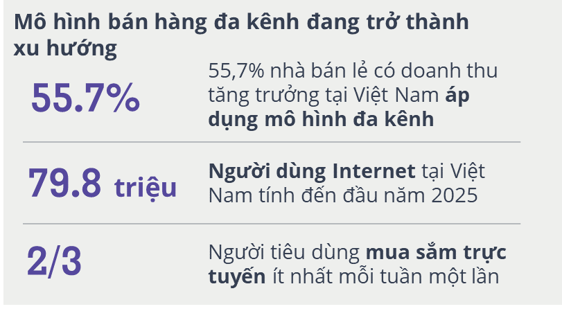 Để thích ứng, các nhà bán lẻ đang đẩy mạnh chiến lược đa kênh. Năm 2024, 55,7% nhà bán lẻ có doanh thu tăng trưởng tại Việt Nam áp dụng mô hình đa kênh. Gần hai phần ba người tiêu dùng mua sắm trực tuyến ít nhất mỗi tuần một lần, dù vậy, mong muốn trải nghiệm trực tiếp vẫn ở đó. Điều này tạo ra tâm lý chuộng sự tiện lợi trong hành vi mua sắm, đồng thời duy trì lực cầu đối với không gian vật lý.