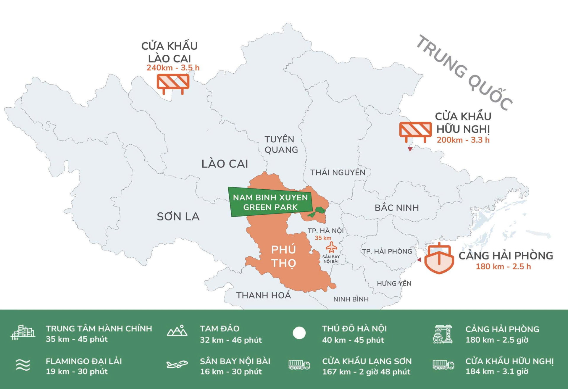 Nam Bình Xuyên Green Park tọa lạc tại tỉnh Phú Thọ - địa phương duy nhất tại Việt Nam giáp ranh với tới 7 tỉnh, thành phố, đóng vai trò trung tâm liên kết vùng của miền Bắc. Nơi đây được ví như “ngã ba giao thương”, kết nối trực tiếp với Thủ đô Hà Nội và các trung tâm công nghiệp lớn như Bắc Ninh, Hải Phòng, Hưng Yên, Lào Cai. Phía Nam dự án tiếp giáp thủ đô Hà Nội.