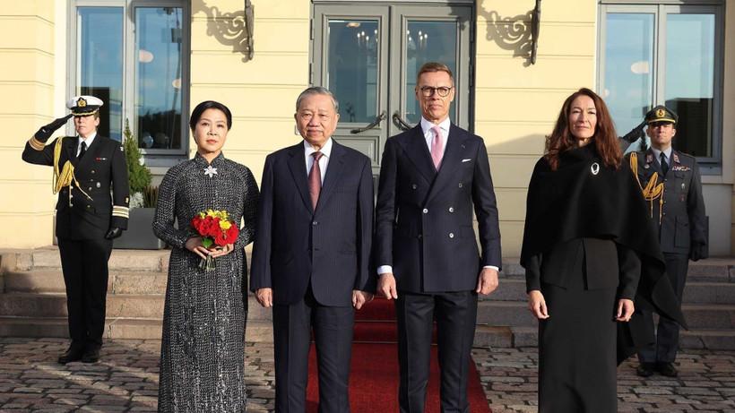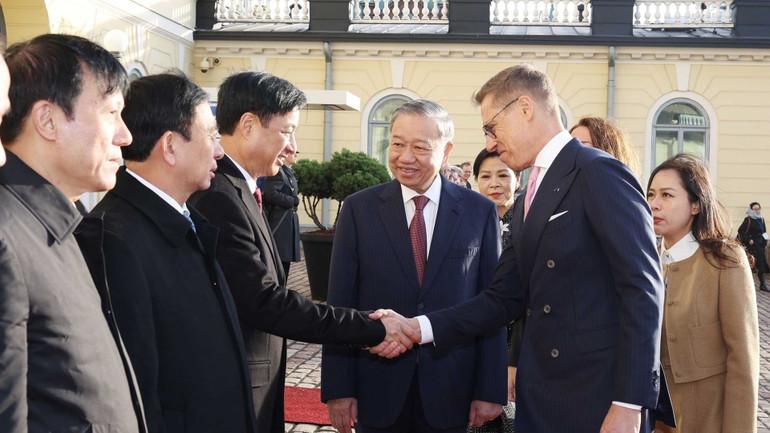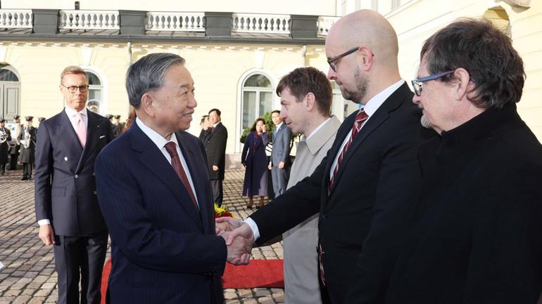 Vào lúc 10 giờ (theo giờ địa phương, tức 14 giờ theo giờ Việt Nam), xe của Tổng Bí thư Tô Lâm và Phu nhân tiến vào Phủ Tổng thống. Đón tại nơi đỗ xe, Tổng thống Alexander Stubb cùng Phu nhân tặng hoa, bắt tay chào mừng và mời Tổng Bí thư Tô Lâm cùng Phu nhân Ngô Phương Ly vào vị trí danh dự.