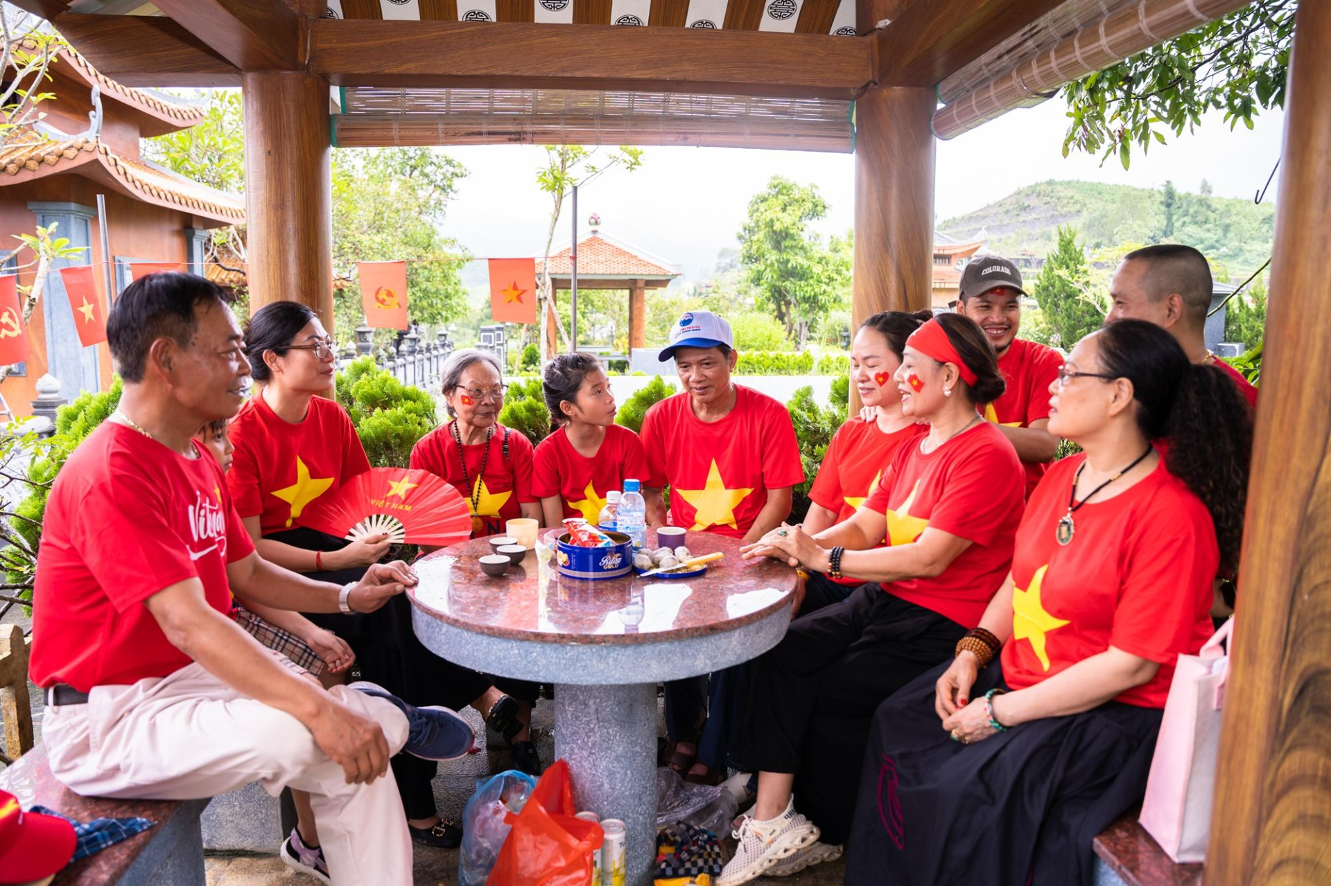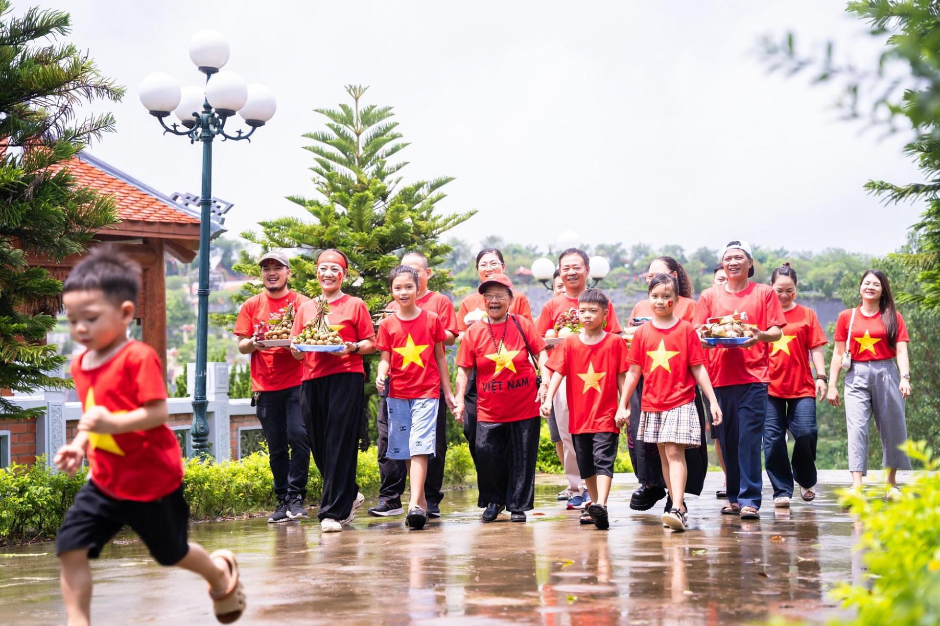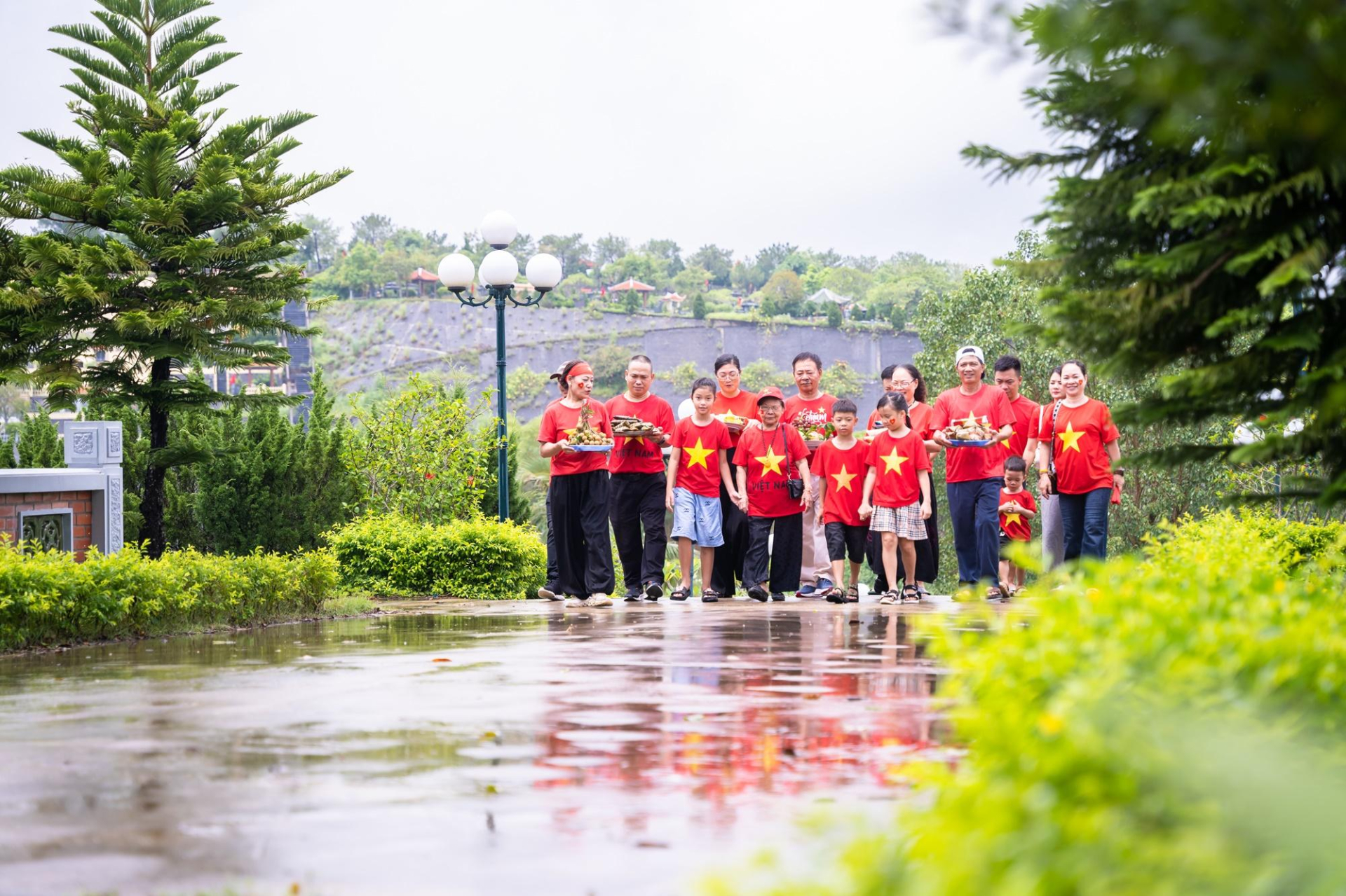 Hình ảnh những gia đình mặc áo cờ đỏ sao vàng, tay bưng mâm lễ thành kính dâng hương trong không gian rợp sắc cờ không chỉ thể hiện tinh thần "uống nước nhớ nguồn", mà còn gợi lên sự kết nối giữa thế hệ hôm nay với truyền thống của cha ông, giữa nét xưa và hơi thở cuộc sống hiện đại.