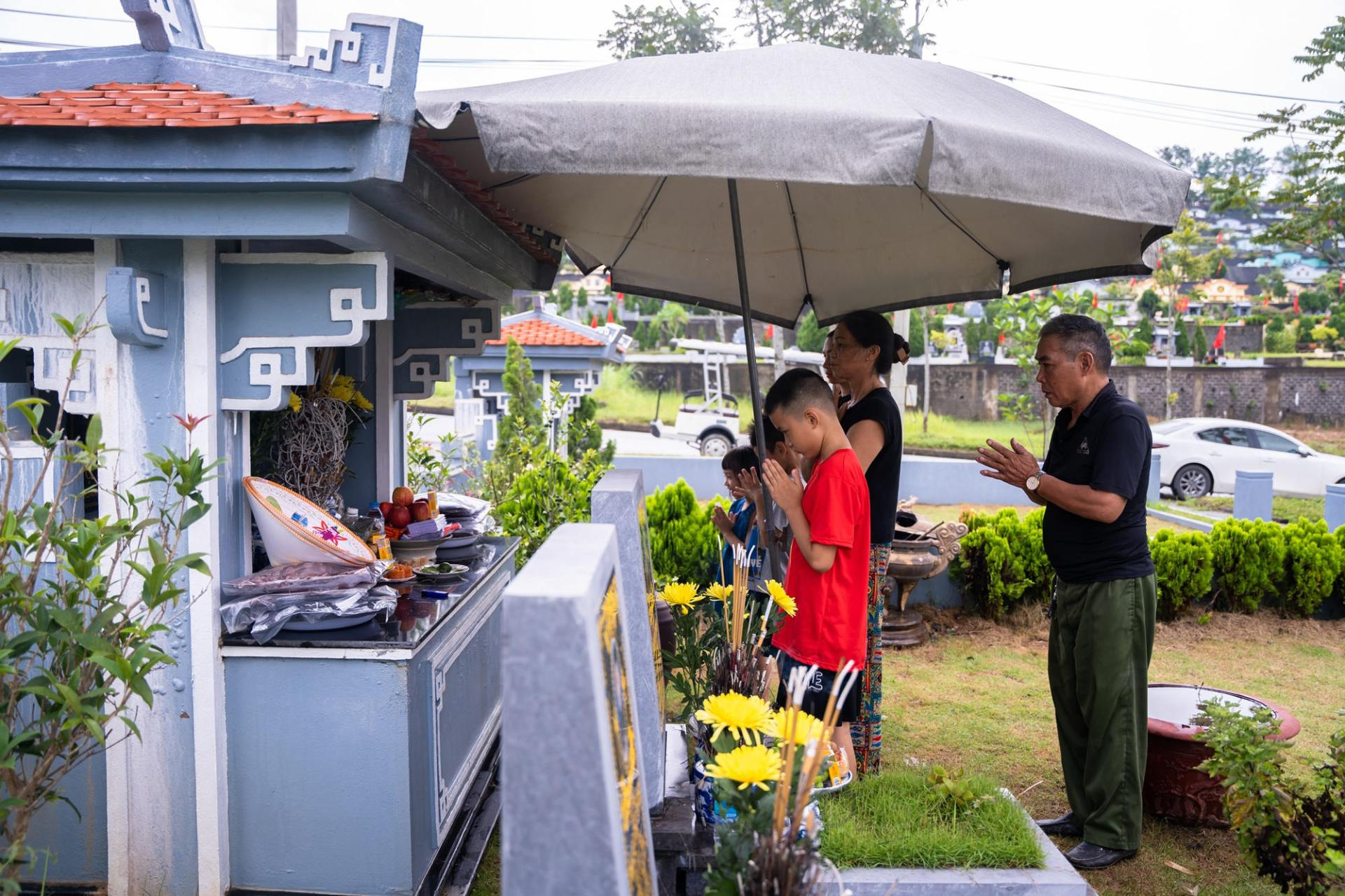 Sáng một ngày cuối tuần trước thềm Quốc khánh, gia đình bà Nguyễn Thị Bích Ngọc (Hà Nội) gồm 14 thành viên đã vượt hàng chục kilomet đến Công viên Tâm linh Lạc Hồng Viên (nay thuộc tỉnh Phú Thọ) để dâng hương cho ông bà, tổ tiên. Trong trang phục áo cờ đỏ sao vàng, cả gia đình cùng nhau thành tâm bên mộ phần, bày tỏ lòng tri ân và hiếu kính.