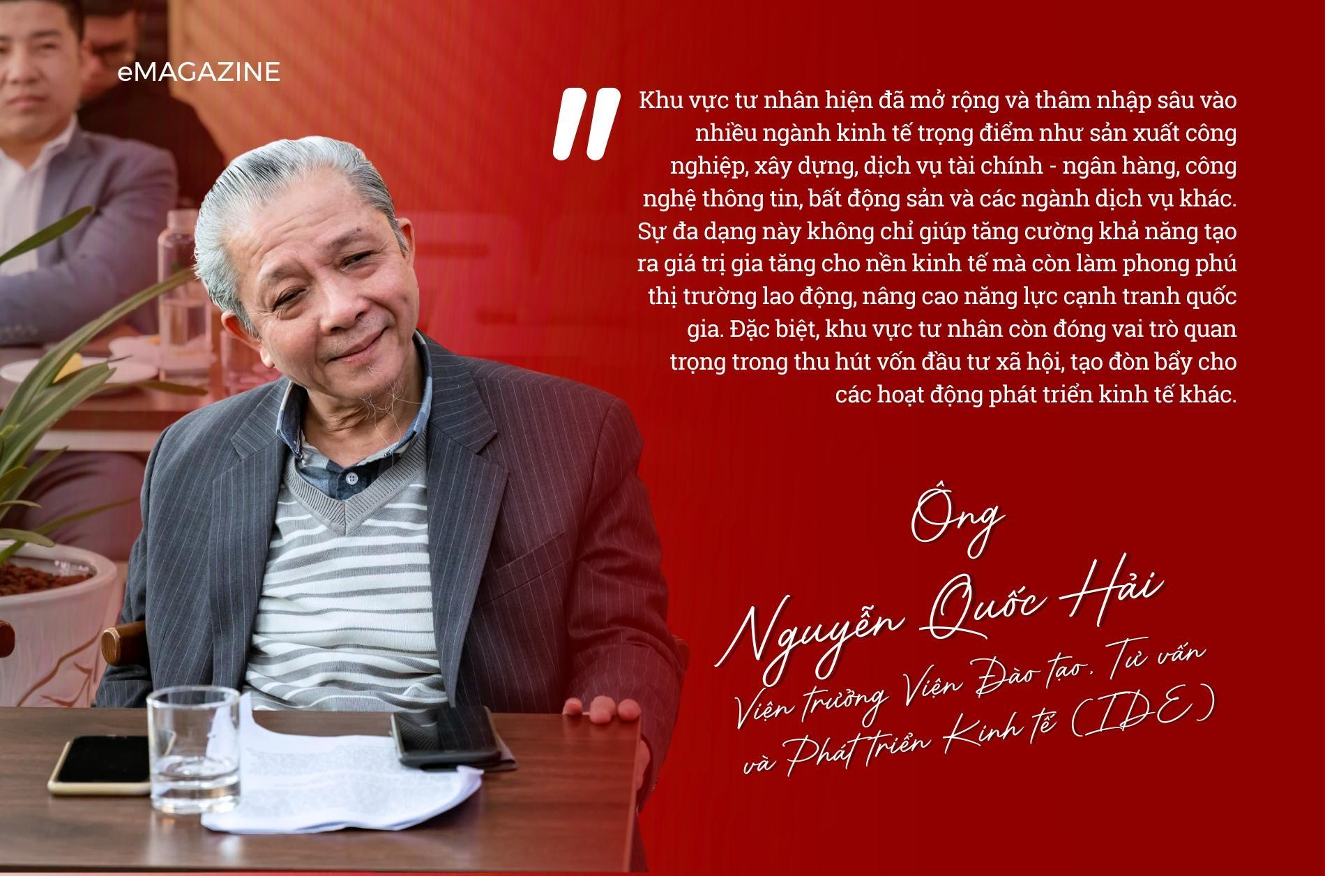 Trong bối cảnh nền kinh tế Việt Nam đang chuyển mình mạnh mẽ với sự tham gia ngày càng sâu rộng của khu vực tư nhân, ông Nguyễn Quốc Hải – Viện trưởng Viện Đào tạo, Tư vấn và Phát triển Kinh tế chia sẻ: "Khu vực tư nhân hiện đã mở rộng và thâm nhập sâu vào nhiều ngành kinh tế trọng điểm như sản xuất công nghiệp, xây dựng, dịch vụ tài chính – ngân hàng, công nghệ thông tin, bất động sản và các ngành dịch vụ khác. Sự đa dạng này không chỉ giúp tăng cường khả năng tạo ra giá trị gia tăng cho nền kinh tế mà còn làm phong phú thị trường lao động, nâng cao năng lực cạnh tranh quốc gia. Đặc biệt, khu vực tư nhân còn đóng vai trò quan trọng trong thu hút vốn đầu tư xã hội, tạo đòn bẩy cho các hoạt động phát triển kinh tế khác".
