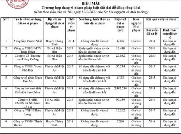 Theo danh sách được công bố, các doanh nghiệp vi phạm do sử dụng đất chậm so với tiến độ đã cam kết với diện tích lớn như: Công ty TNHH Một thành viên Toàn Thiện và Công ty Cổ phần thương mại Hùng Cường với diện tích vi phạm tương ứng là 13.440m2 và 20.882m2; Công ty TNHH thương mại dịch vụ và xây dựng Nam Cổ Cò (thị xã Điện Bàn), diện tích vi phạm là 93.539m2.