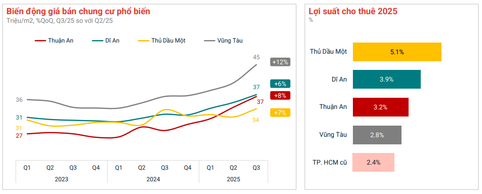 So với đầu năm, Bình Dương chứng kiến mức tăng trưởng ngoạn mục tới 165%, bỏ xa các khu vực khác. Đồng Nai tăng 89%, Bà Rịa - Vũng Tàu đạt 98%, còn Long An cũng bứt phá 88%. Sức nóng này phản ánh xu hướng dịch chuyển mạnh mẽ của dòng tiền ra khỏi TP.HCM, hướng đến các khu vực có hạ tầng giao thông ngày càng hoàn chỉnh, quỹ đất rộng và giá bán còn dư địa tăng. Đây chính là những yếu tố đáp ứng tốt cả nhu cầu ở thực lẫn đầu tư dài hạn.