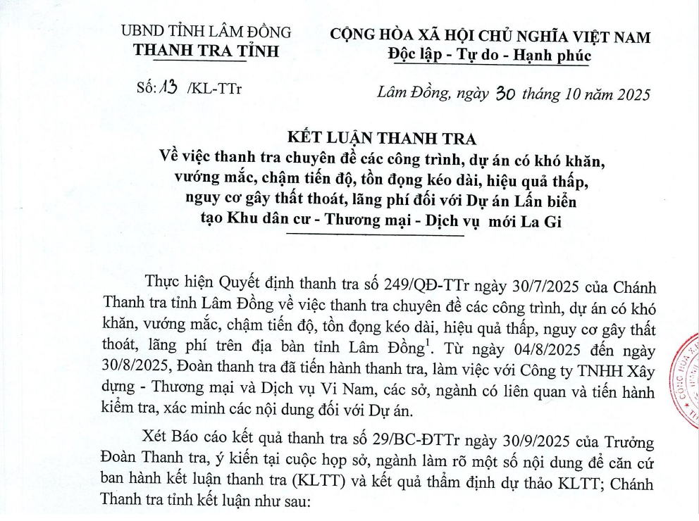 Thanh tra tỉnh Lâm Đồng vừa công bố kết luận thanh tra dự án lấn biển tạo Khu dân cư - Thương mại - Dịch vụ mới La Gi (dự án La Gi) của Công ty TNHH Xây dựng - Thương mại và Dịch vụ Vi Nam.