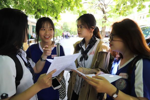 Thí sinh trao đổi bài sau khi dự thi bài thi khoa học tự nhiên tại điểm thi Trường THPT Bình Phú (Q.6, TP.HCM) năm 2019 – Ảnh: NHƯ HÙNG