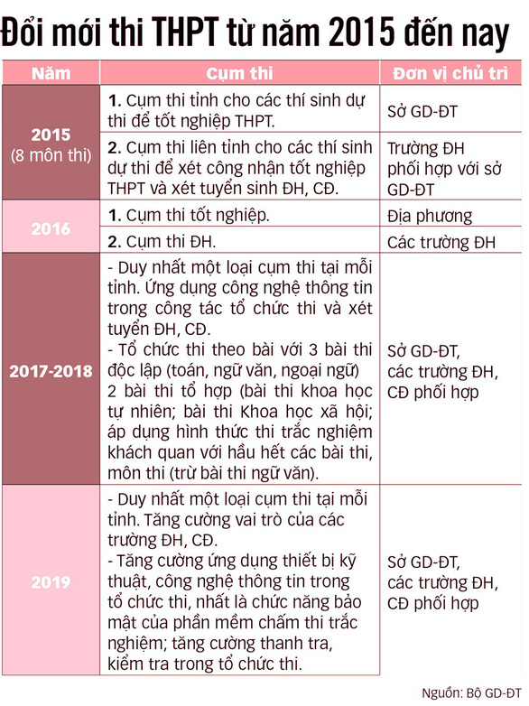 Khi đó, một thí sinh muốn dự thi THPT quốc gia sẽ có thể đăng ký thi một hay nhiều đợt trong năm, kết quả thi của đợt nào cao nhất sẽ được sử dụng để xét tốt nghiệp THPT và có thể cung cấp cho các trường ĐH, các trường thuộc hệ thống giáo dục nghề nghiệp để tuyển sinh nếu có nhu cầu.