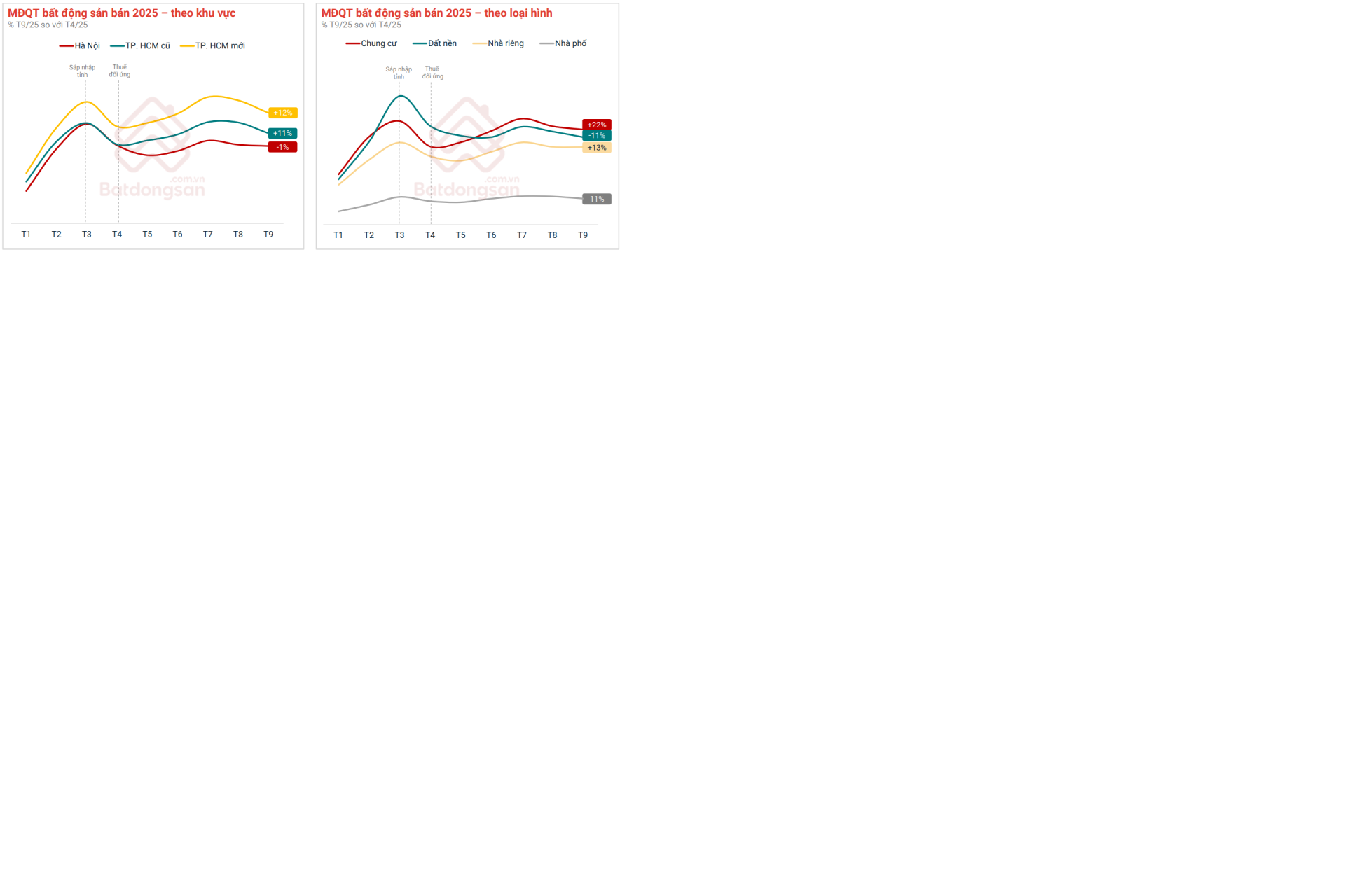 Dữ liệu lớn của nền tảng công nghệ Batdongsan.com.vn cho thấy thị trường bất động sản năm 2025 đang thiết lập nhịp tăng trưởng ổn định. Mức độ quan tâm bất động sản cuối quý 3/2025 tăng đáng kể so với tháng đầu quý 2/2025. Trong đó, chung cư tăng 22%, nhà riêng tăng 13%, nhà phố tăng 11%, riêng đất nền giảm 11%.