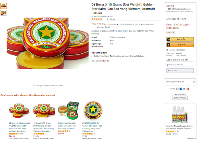 Đầu năm 2017, cao Sao Vàng làm dậy sóng những người trong nước khi xuất hiện trên trang thương mại điện tử Amazon hay eBay với giá bán rất cao, gấp vài chục lần so với thị trường trong nước. Đây cũng là sự kiện vô tình vực dậy dòng sản phẩm này. Những sản phẩm cao Sao Vàng luôn trong tình trạng gần hết hàng và nhận được phản hồi tích cực của người tiêu dùng nước ngoài. Thậm chí ở một số quốc gia còn có phong trào “mở nắp cao Sao Vàng để chứng tỏ sự trưởng thành”. Dẫu đây là trào lưu vui, nhưng đã góp phần đưa thương hiệu Việt vươn xa trên thị trường quốc tế.