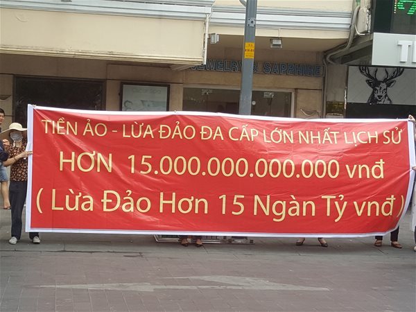 Các nhà đầu tư căng băng rôn trước Công ty Modern Tech tố cáo bị lừa đảo hơn 15.000 tỷ đồng hồi năm 2018. (Ảnh: Dân Việt)